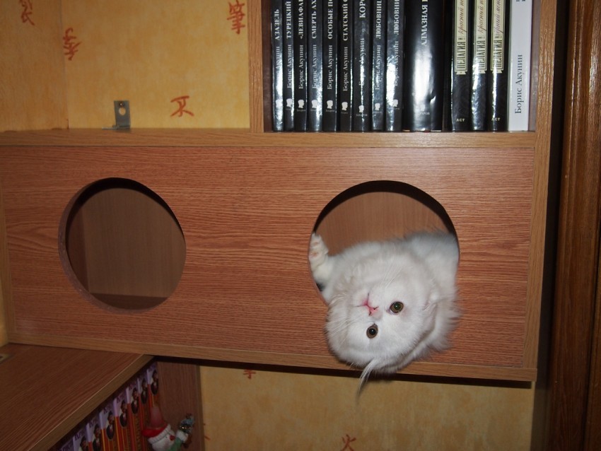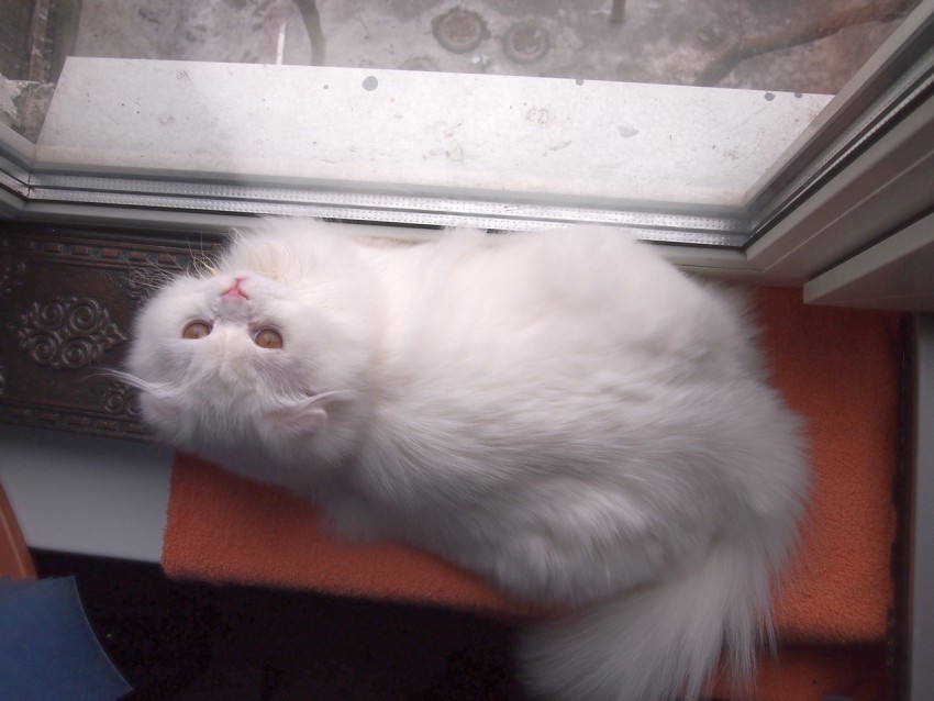 А вот на фотке ниже январь, вислоухая котейка еще на два месяца младше. Тоже глаза желтые, но еще не настолько яркие. Конечно, цвет глаз зависит от освещения, поэтому невозможно точно назвать дату, когда цвет сформировался окончательно. Вроде после 7-8 месяцев больше не меняется.