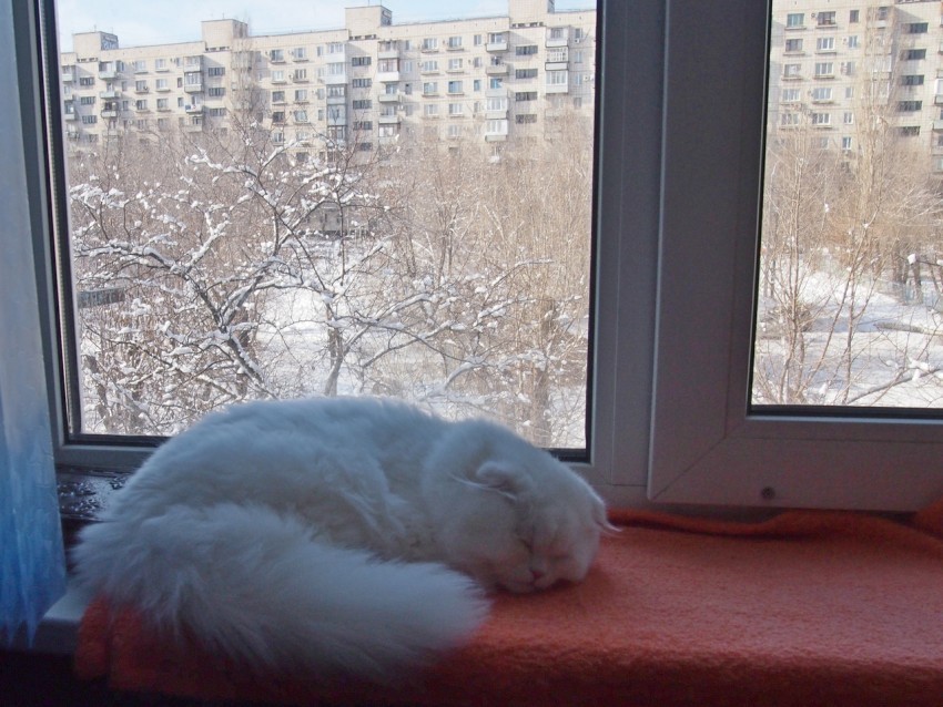 А это у нас февраль с одной стороны окна и шотландский вислоухий пушистик с другой. Белый снег, белый кот, на растрескавшейся земле…