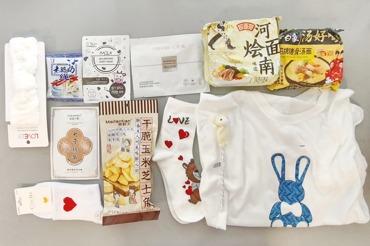 Есть мнение, что мужчины хуже различают цветовые оттенки. У меня в профиле написано: "Любимые цвета: бежевый, молочный, кремовый". Мой Дед Мороз отправил мне белую посылку. Обычно чистый белый создаёт резкий контраст, кремовый же делает гамму мягче, тише. Однако, если откинуть отклонение в оттенках, посылка вышла хорошей, по интересам, гармоничной. Носки и футболка - на лето самое то, лапша и снеки - Институт Доширакологии одобряет, успокаивающие маски для лица и косметическая повязка на голову - то, что нужно после долгого пребывания на солнце. Май будет уютным и тёплым.
