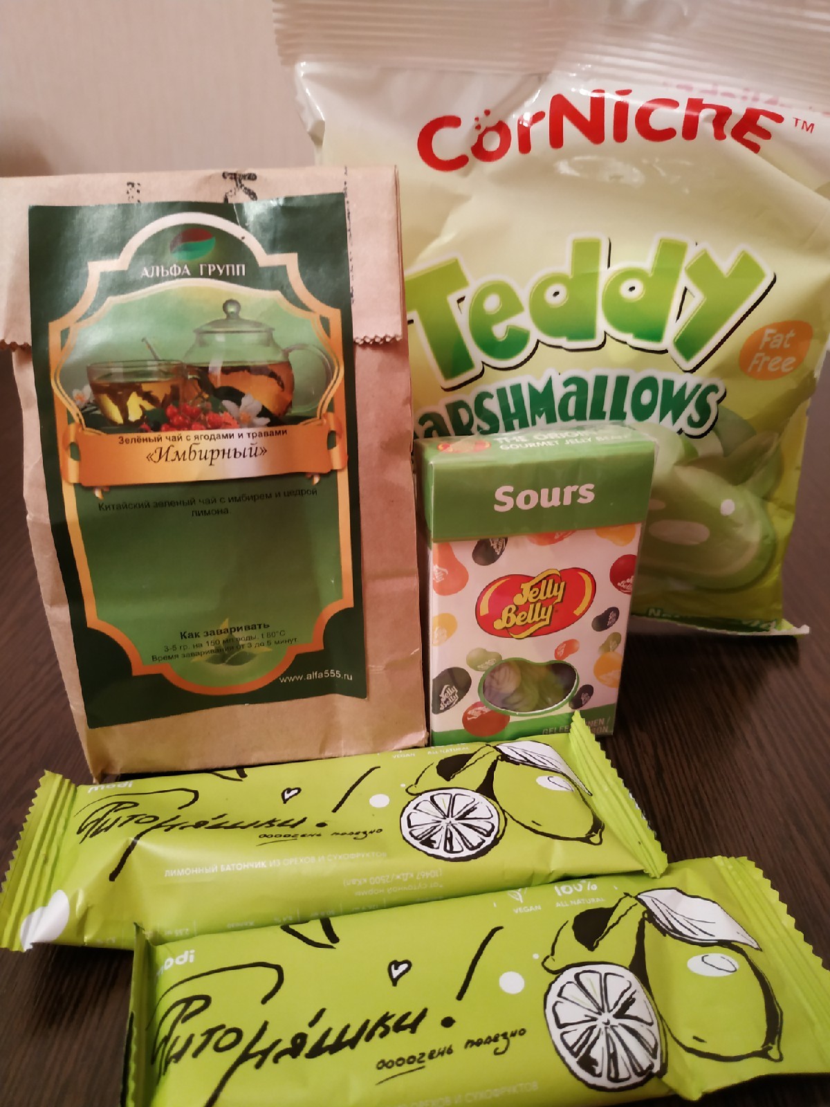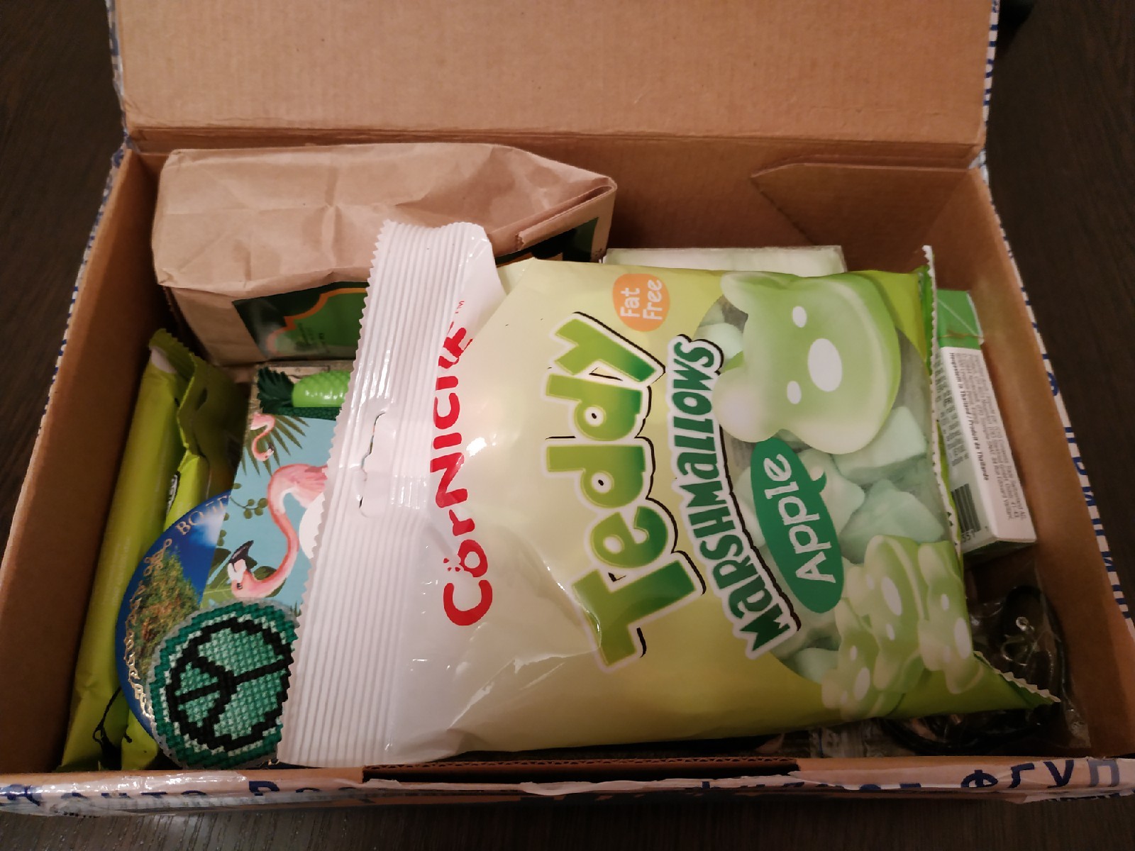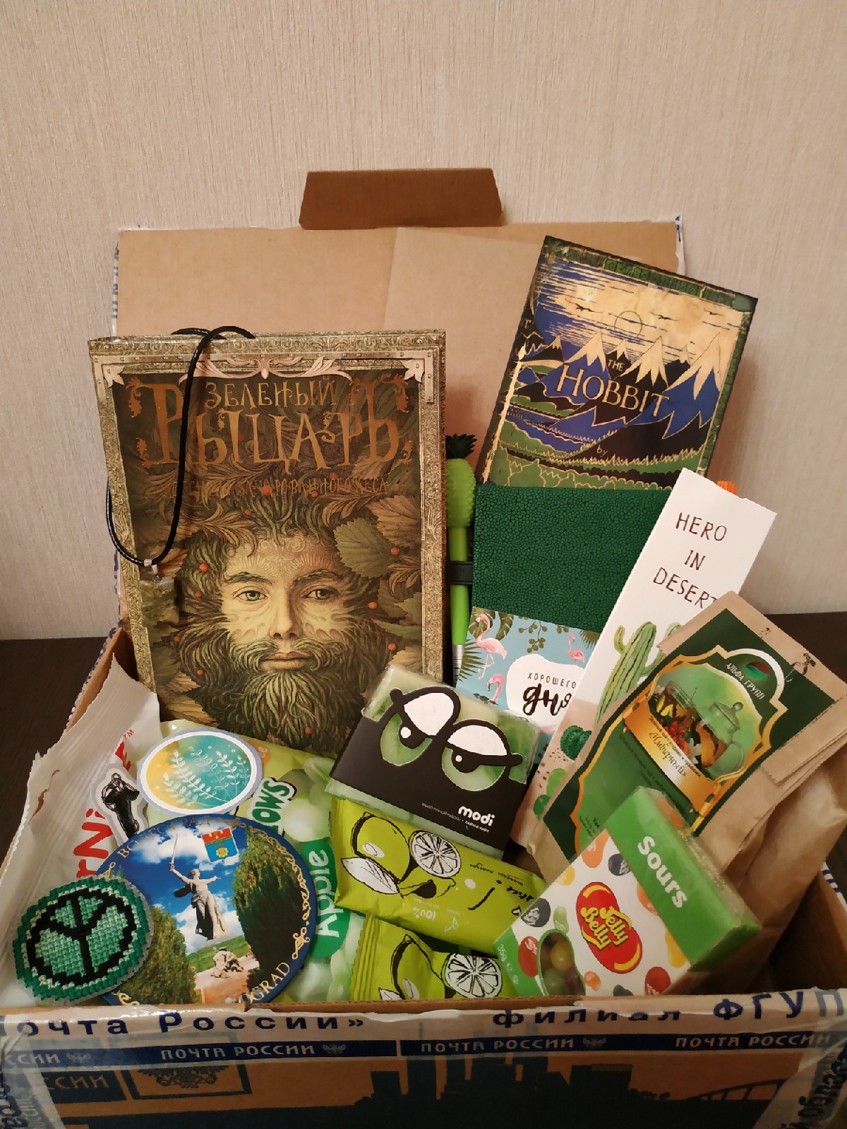 Немного дрожащими от волнения руками я принялась за ее распаковку! И вот уже с первого взгляда я в восторге! Моя внимательная отправительница оформила посылку в моем любимом зеленом цвете. Приступаю к более детальному изучению содержимого, умиляясь и радуясь каждому подарочку!