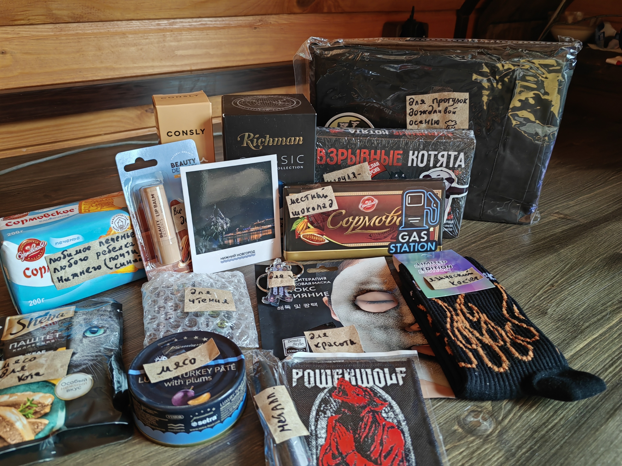 Моя замечательная Снегурочка, не смотря на то, что это ее первый цветной обмен, очень ответственно подошла к выбору подарка, подписала каждую вещь, что очень ценно, учла интересы и предпочтения, как и музыкальные, так и в играх и остальном, прикольные закладки и брелоки с персонажами игры, вкусняшки региона отправителя, все эти милые и полезные вещи, в том числе огонь носки, дождевик, подарили очень хорошие эмоции. Еще раз, большое спасибо, все шикарно. И от кота, тоже благодарность.