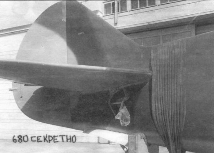 Хвостовое оперение ЛаГГ-3 №3121376, выпущенного на заводе №21 в Горьком 10 июня 1941 г. Это был один из 28 истребителей, получивших многоцветный камуфляж На фото видны пятна трех цветов: песчаного, черного и зеленого.