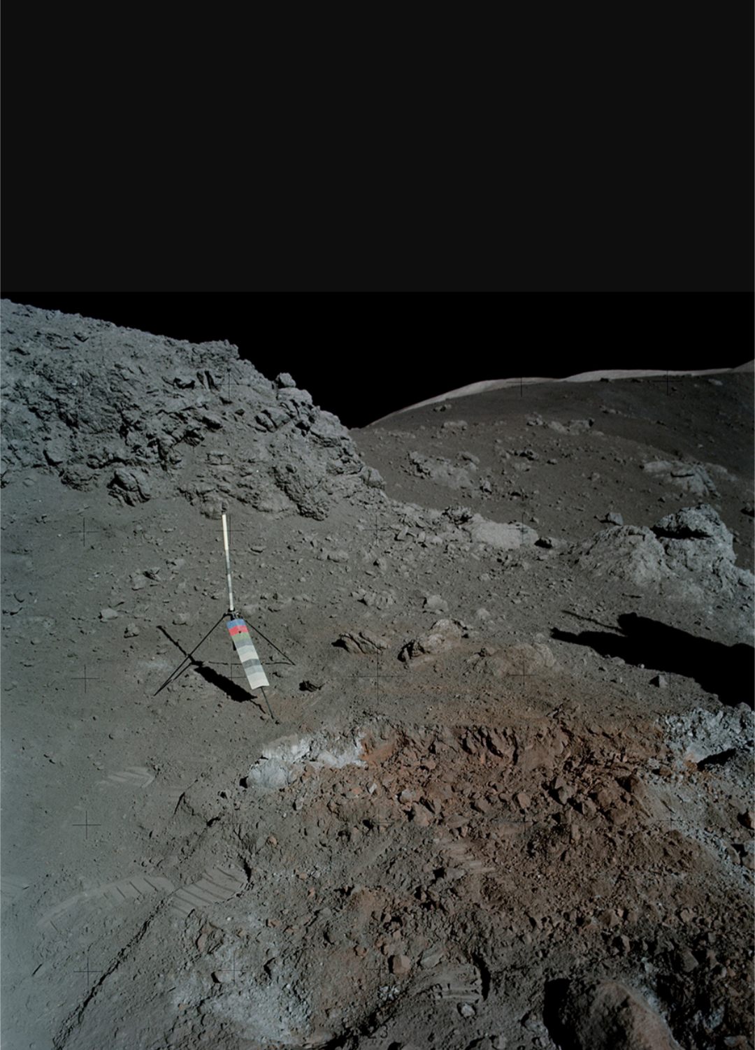 Да-да, реголит находится под какой-то породой. Слой, образованный всякой метеоритной хренью и прочими штуками, падающими на луну и запекающимися под солнцем находится ещё под чем-то. Держи, ты потерял 🤡🤡🤡Да, кстати, что это там за тёмные и светлые холмы на заднем плане?