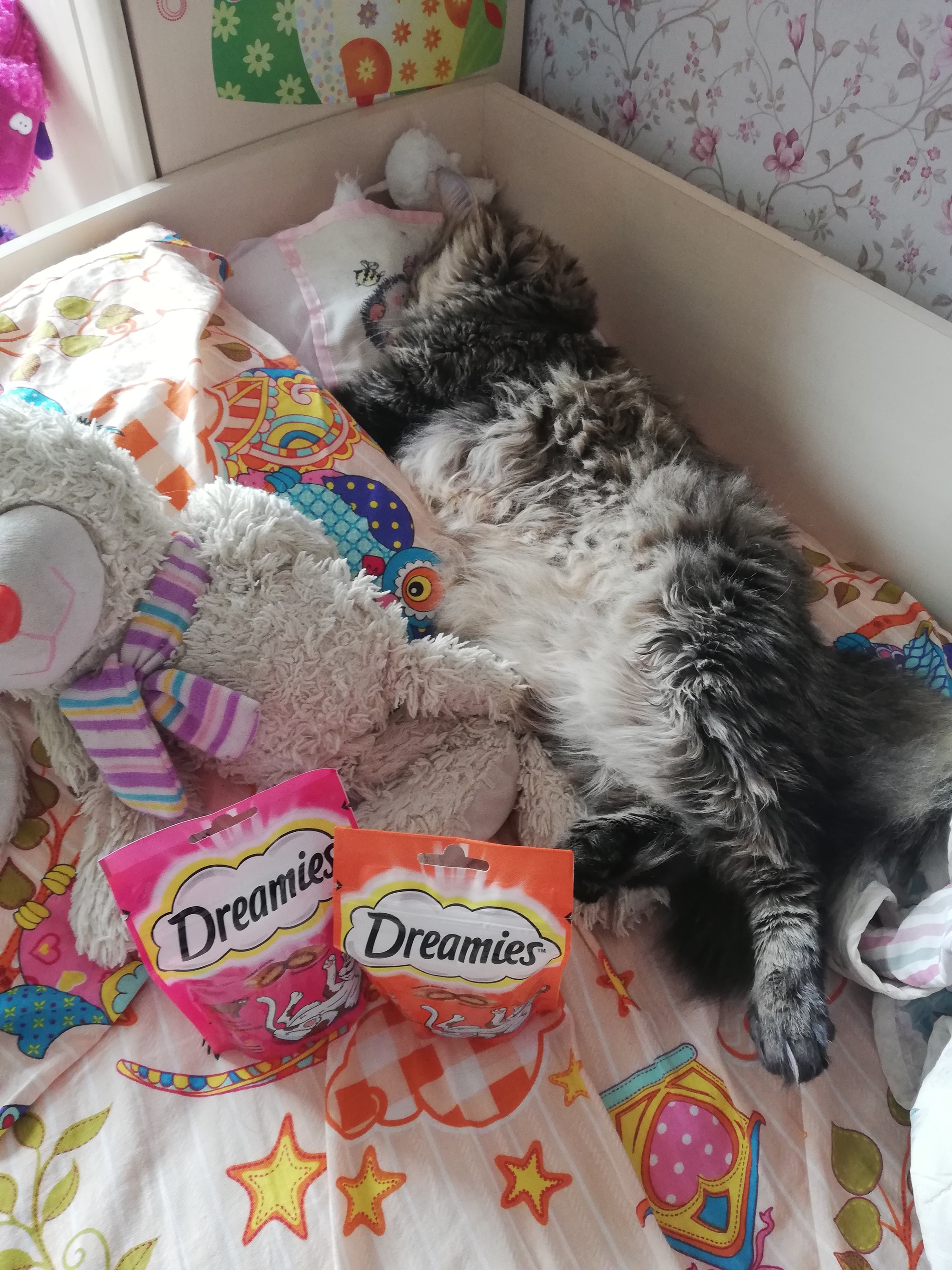 Кот у меня лентяй и в основном дрыхнет у дочки на подушке, вот и сейчас спит и не чует сколько счастья привалило.