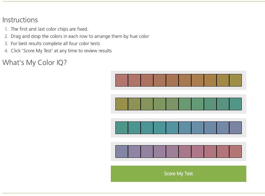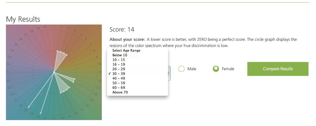 Нужно выстроить квадратики (двигаются при удержании мышкой) по возрастанию оттенков в правильном порядке в каждом из четырех рядов. Чем меньше результат в цифрах (Score), тем лучше! Идеально — НОЛЬ. Для точного результата необходимо также выбрать свой пол (Gender): Male — мужчина, Femaie — женщина и возраст по шкале (Age range: 20-29 / 30-39 и т д).