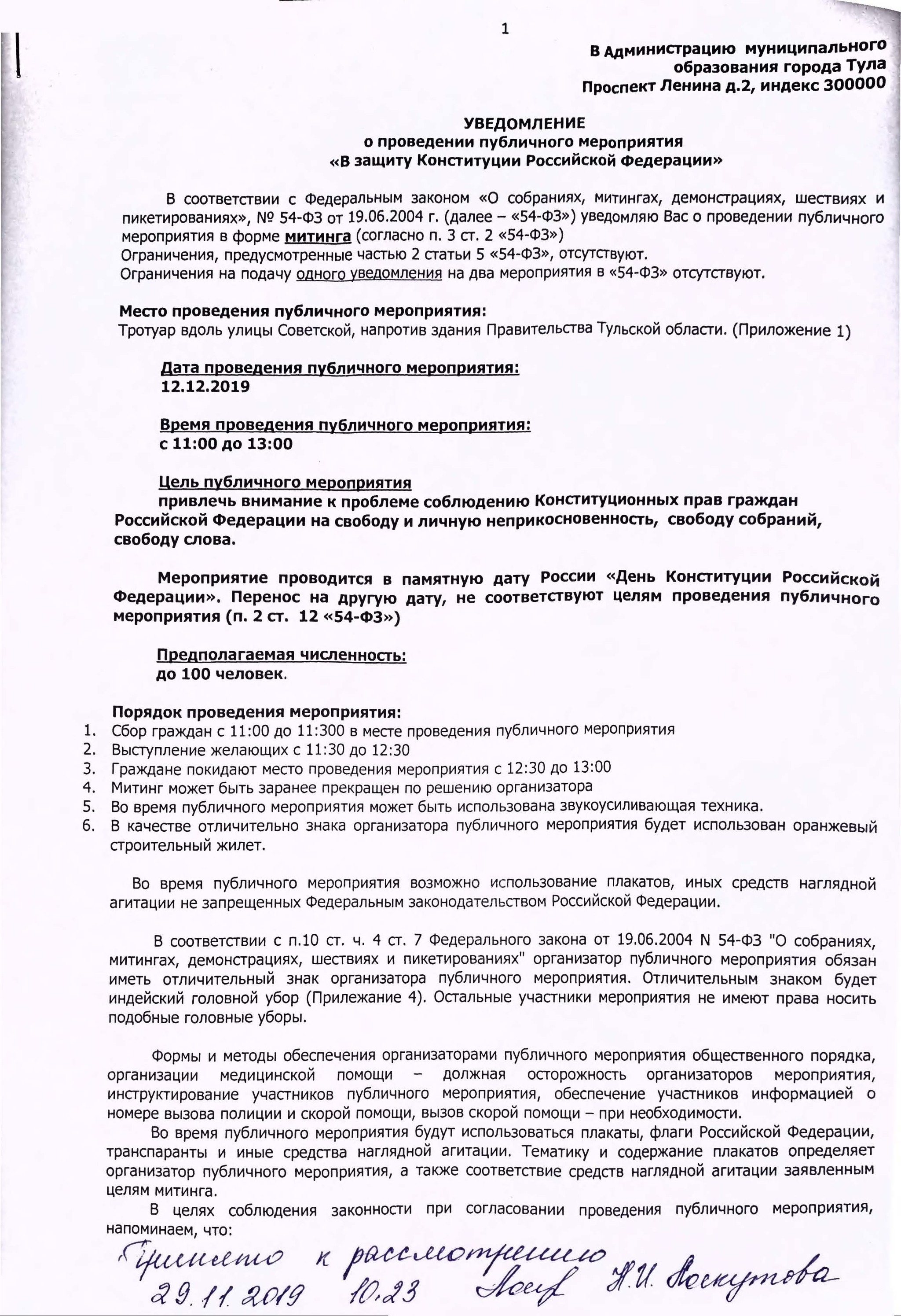Согласно п. 3.1.4 Устава Движения в защиту прав избирателей «Голос» Движение в порядке, установленном законодательством Российской Федерации, имеет право проводить собрания, митинги и демонстрации, шествия и пикетирование. Я как Председатель Регионального Движения «Голос» в Тульской области решил реализовать своё право, согласно п. 7.12.2. и 7.12.3. Устава Движения, Реализуя свое право на проведение публичных мероприятий, которое закреплено в ст. 31 Конституции РФ, 29.11.2019 я подал уведомление о проведении митинга «В защиту Конституции Российской Федерации» на территории, прилегающие к зданиям, в которых размещаются органы государственной власти Тульской области, на расстоянии менее 100 метров от любой точки периметра указанного здания, а это, согласно ст. 5 ЗТО № 1870 от 17.12.2012 года «О регулировании отдельных вопросов проведения публичных мероприятий на территории Тульской Области» запрещено.