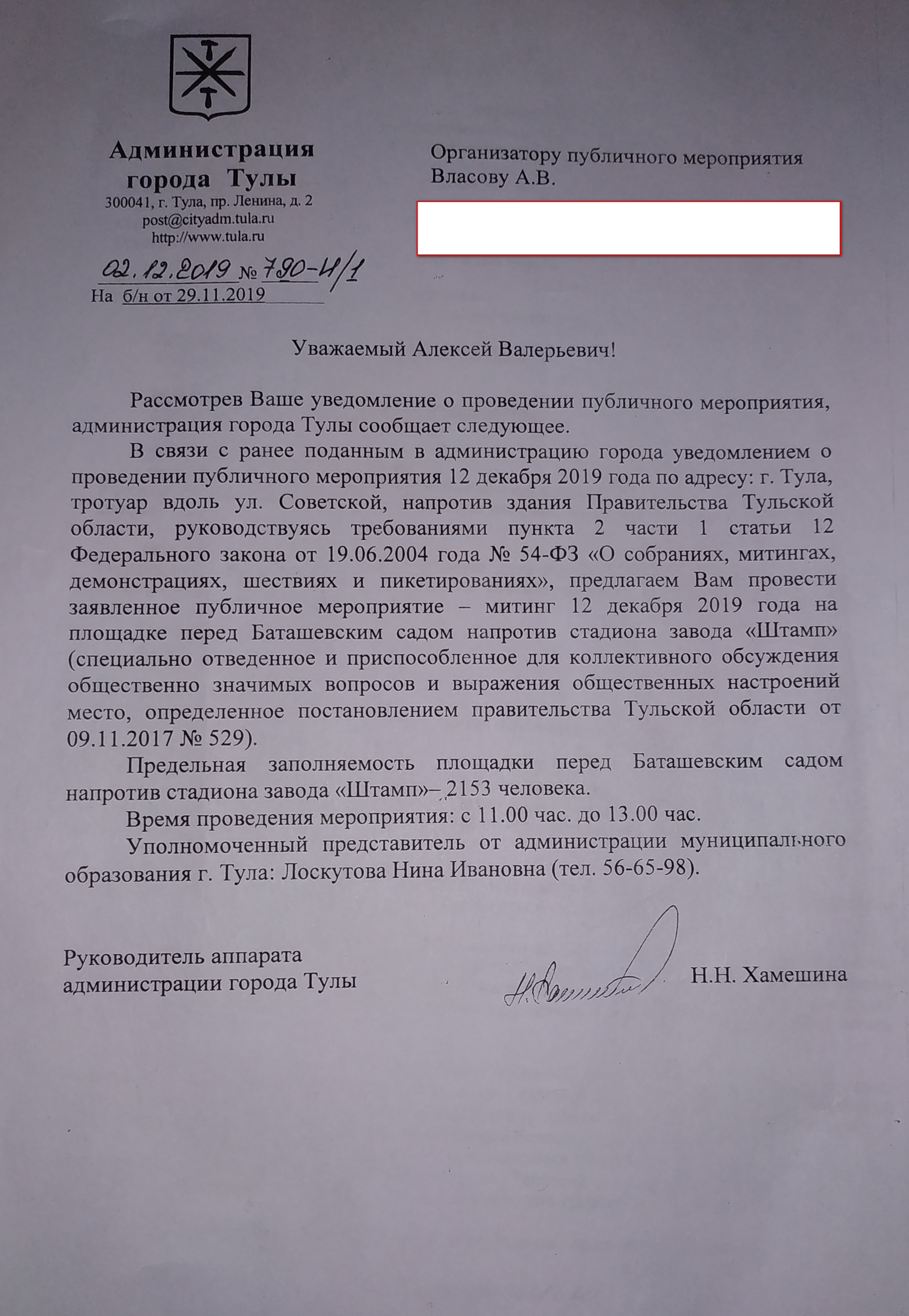 Указания на то, что на данной площадке будет проводиться иное мероприятие недостаточно, поскольку Администрация города Тулы обязана обосновать, почему два мероприятия не могут пройти одновременно. И данные аргументы требуется приводить в ответе, а не потом в суде.