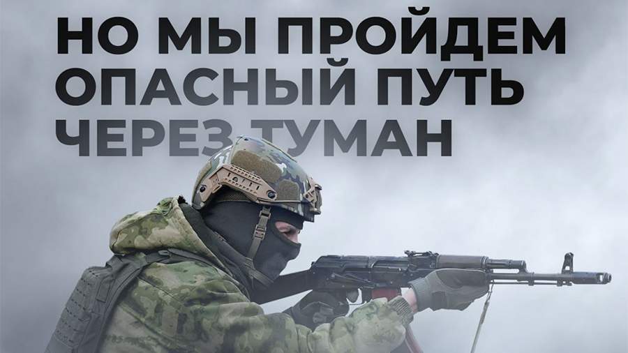 На опубликованном изображении изображен военнослужащий, идущий сквозь густой туман. Рядом приведены строки из музыкальной композиции.