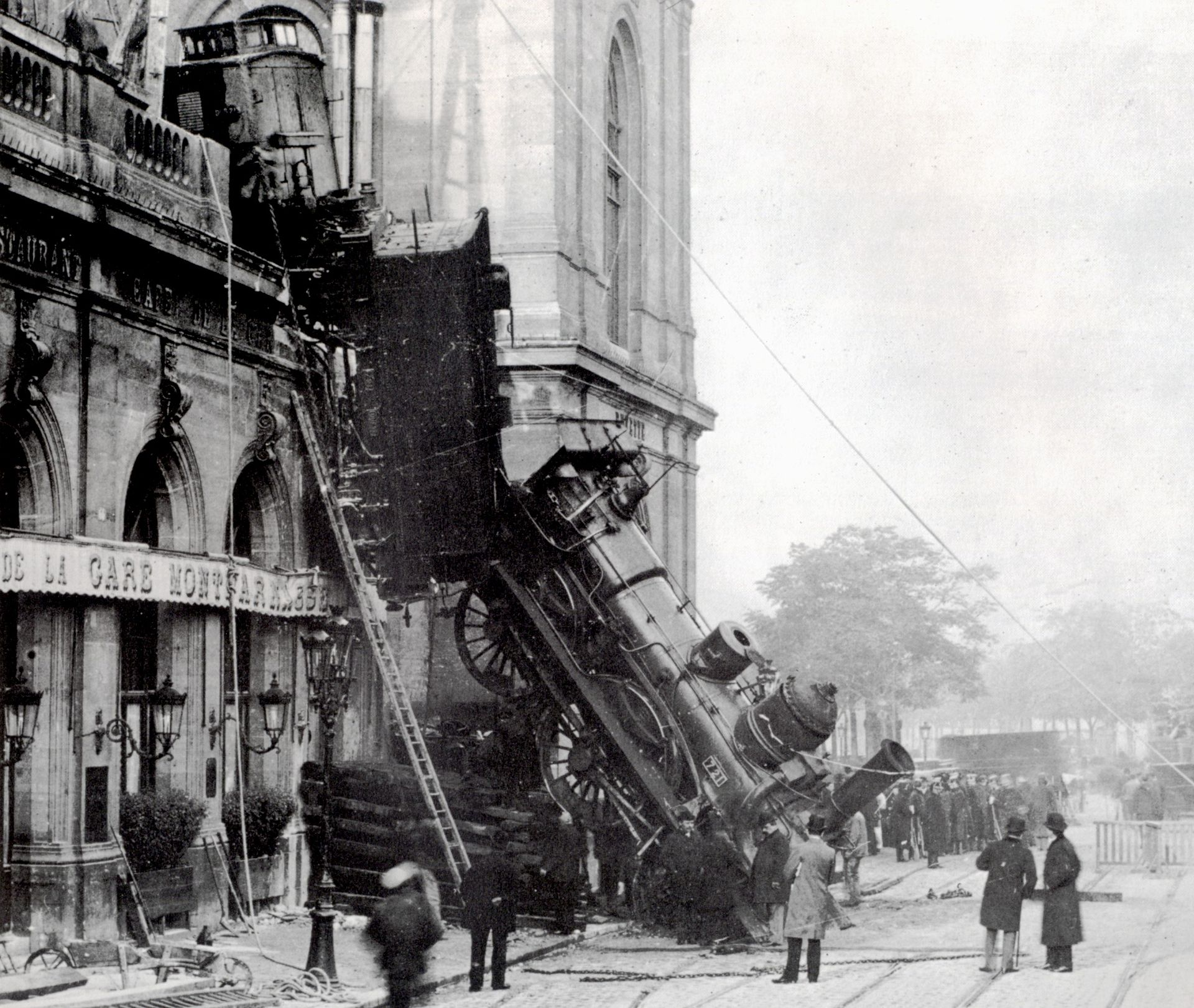 Паровоз пересёк платформу, пробил стену вокзала и остановился лишь в зале ожидания первого и второго классов.