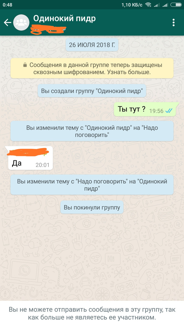 ctpema4ek Юмор Тупой прикол, но я поржал 7 лет назад 1. Создаёшь в whatsapp группу нада поговорить2. Приглашаешь объект надругательства3. Переименовываешь группу в "одинокий пидор" 4. Выходишь из группы, чел становится админом, 95% не знают как расформировать группу5. Профит Хз подобного не нашел [моё] Прикол WhatsApp Тупость Юмор Мат