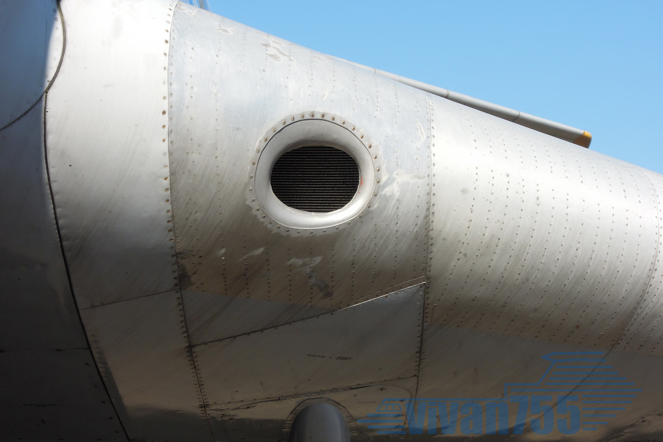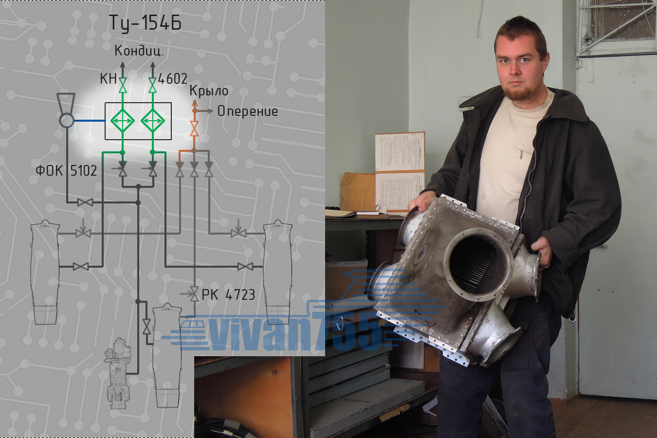 Воздух отбирается от компрессоров двигателей (а компрессор – чуть ли не половина двигателя, самая сложная его часть, он показан в этой статье Двигатель регионального лайнера СССР – Як-40 ) и подаётся в салон. Однако после компрессора воздух горяч – до 300 °С. Как такой подавать в салон? Поэтому сперва воздух охлаждается в ВВР. Но никакой радиатор не может охладить воздух до температуры ниже окружающего воздуха, а в салоне прохладно в жару. Значит, после ВВР есть ещё одна ступень охлаждения. Вот узел охлаждения воздуха Ту-154, вид спереди, виден радиатор: