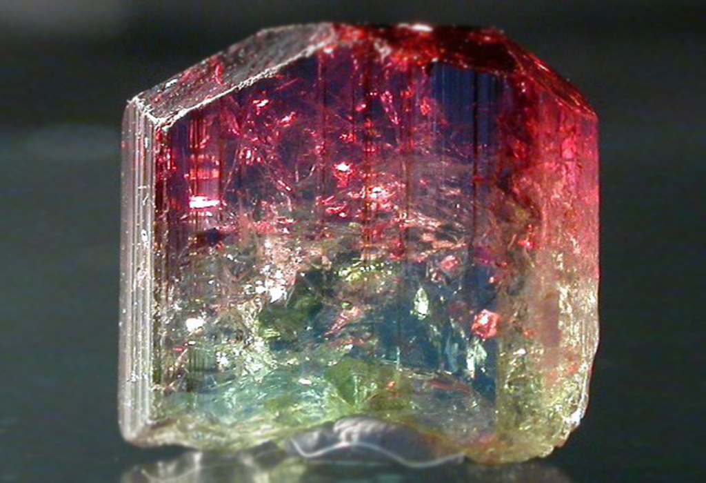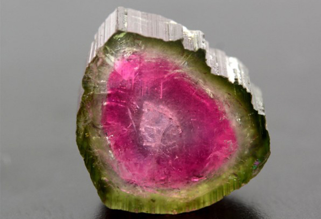 - Арбузный турмалин сочетает в себе белый, красный, зеленый, иногда бурый цвет. Структура такого кристалла напоминает дольку арбуза, что вкупе со специфической окраской и послужило причиной для его названия.