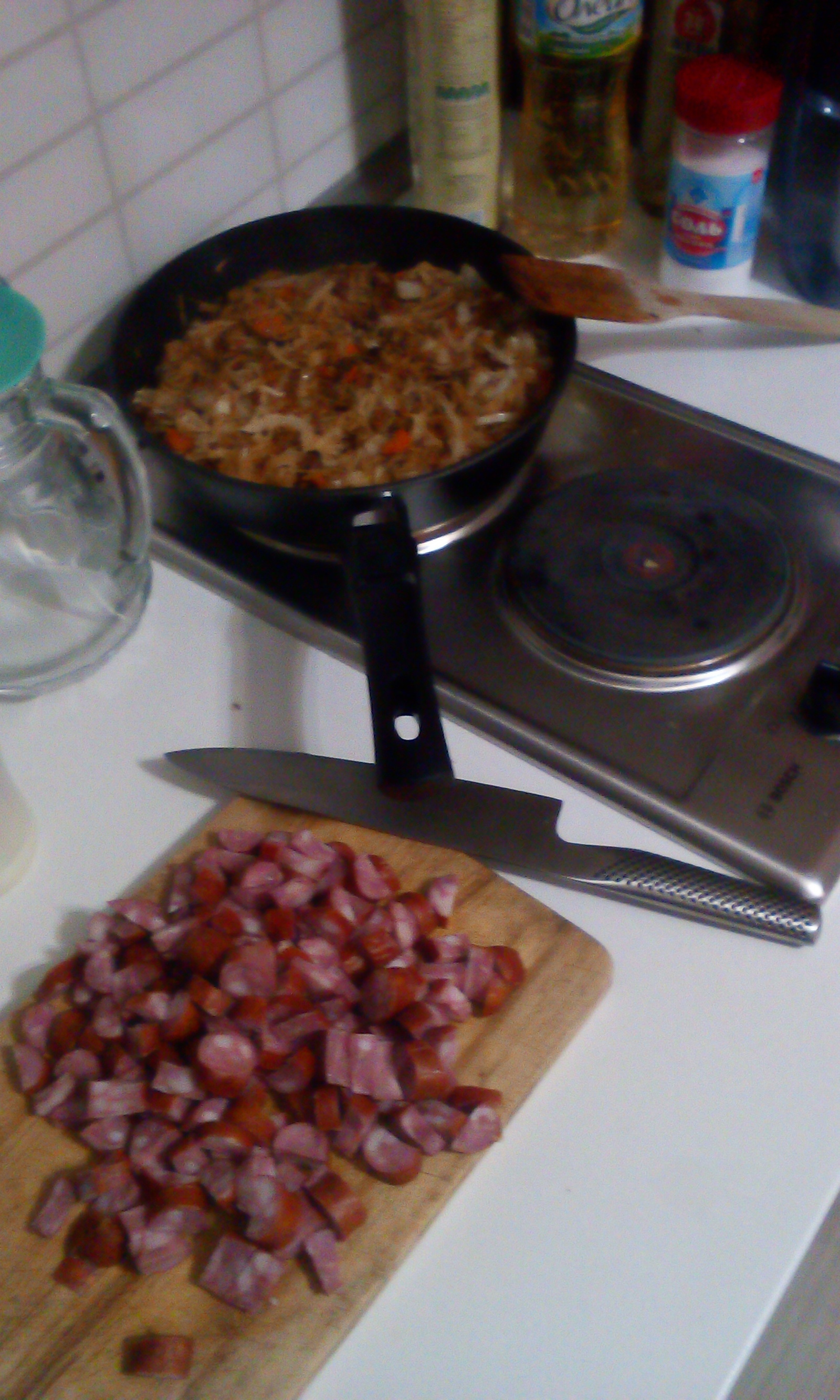 Обжаривать необходимо до полупрозрачного состояния лука. Пока лук доходит до нужной кондиции - подготовим квашеную капусту, немного порубив её на разделочной доске: