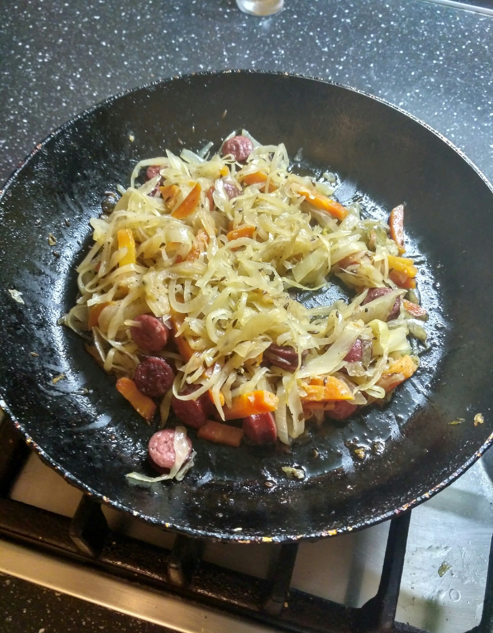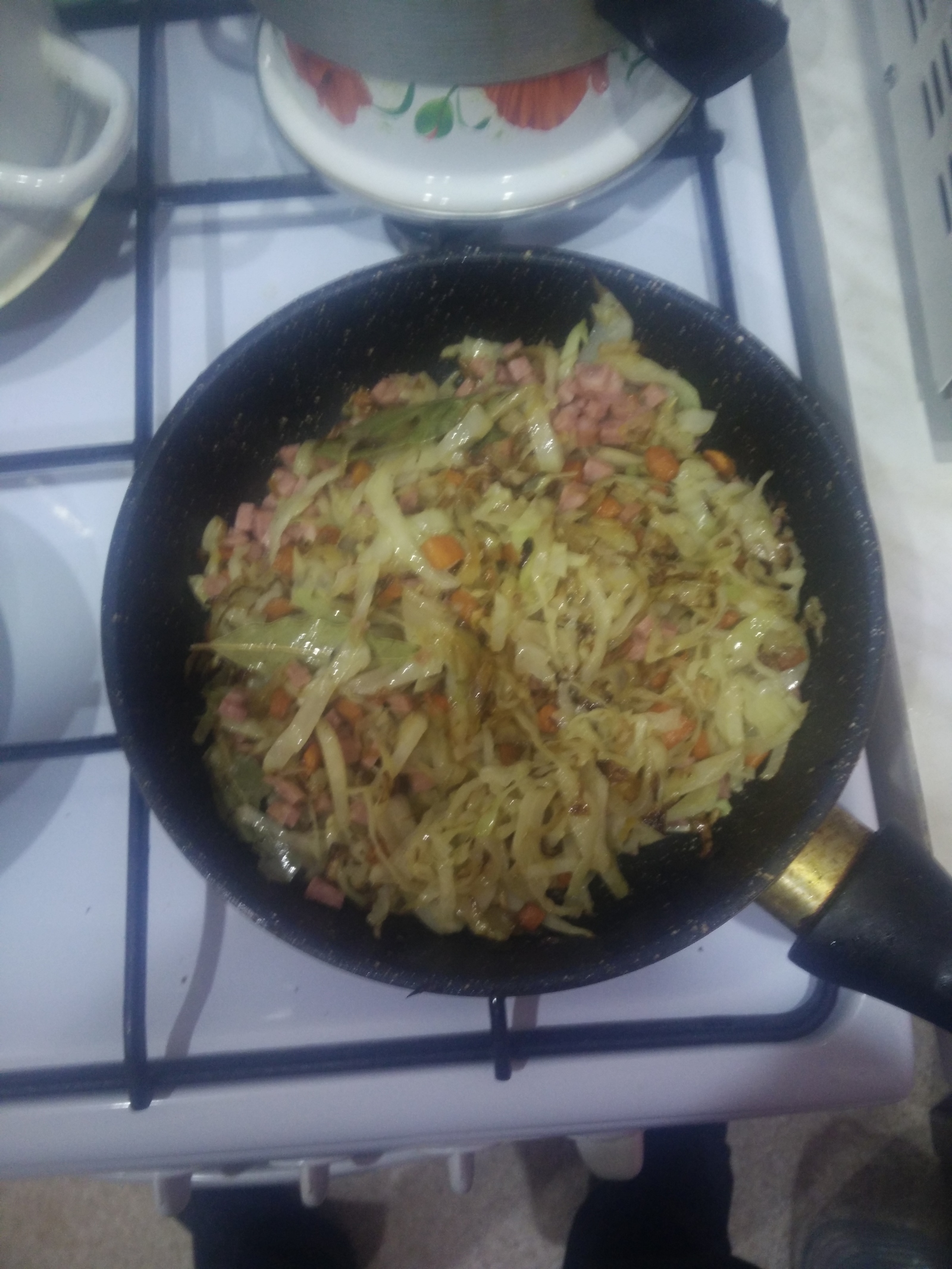 Продолжаем обжаривать на слабом огне. Можно добавить воды и тушить под крышкой. Всё зависит от сочности капусты. По мягкости доводим капусту до того состояния, которое вам нравится.