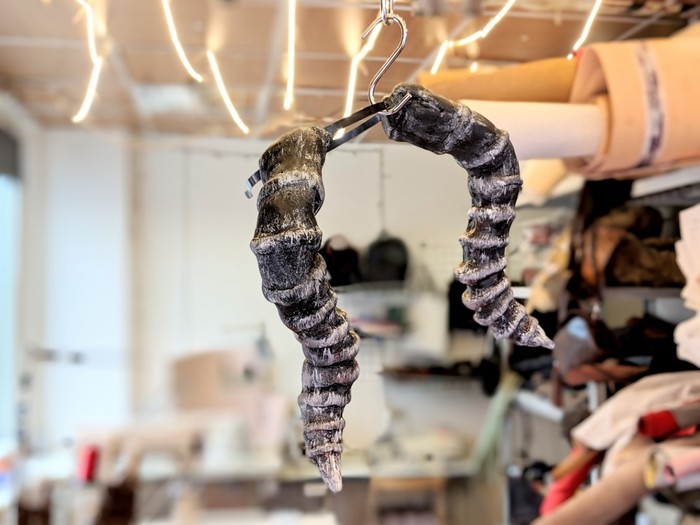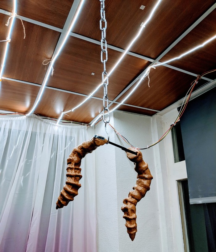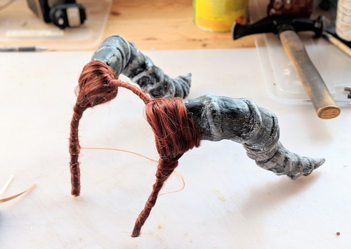 Вот еще недопиленные рога на основе пвх. Здесь я решила сделать их легче, не использовать ворблу, а намотать на заготовку пвх изолон и, поскольку изолон не красится акрилом, задекорировать полосами ткани. Получилось интересно, но неидеально.