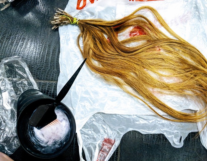 Я решила закрыть металл ободка с помощью волос. Для того, чтобы они идеально совпадали по цвету с моими, я взяла хвост натуральных волос для наращивания и покрасила их.