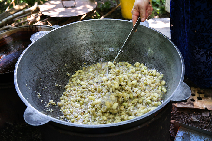 Кондитер засыпает десять небольших ведерок тутовника в большой, разогретый на костре казан. Ягоду не моет — иначе она не будет достаточно сладкой. В казане Зерифа руками выжимает из тутовника весь сок.