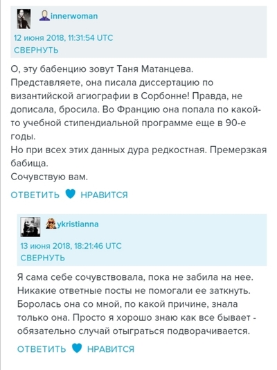 Хз, может, она и вправду неплохой журналист, зарабатывает этим, не гнушаясь грязных приёмов, поэтому активно развивала и развивает свои сообщества в соц.сетях и "выпиливала" конкурентов из ЖЖ в борьбе за места в топе. Я находила её публикации для "Сноб" и Форбс (на сайтах изданий), Татьяна писала о Франции для русскоязычных читателей.... А в голове говно) пока вопросов больше, чем ответов.