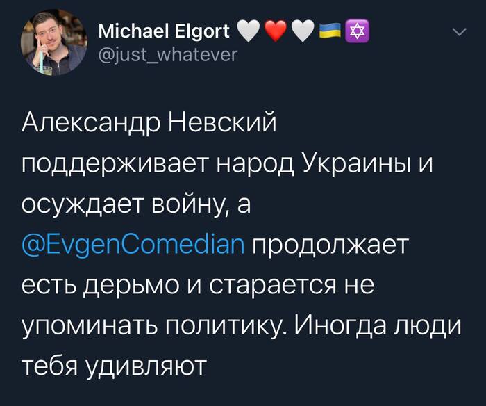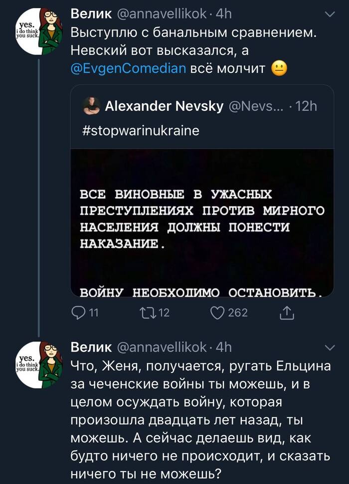 Вот и пришла очередь хейта к Жене. Я думал докатиться быстрее. Все считают, что если он медийная личность он должен высказаться. Я думаю многим людям, здравомыслящим и имеющим эмпатию, понятна позиция Жени по этому вопросу. И так Евген очень часто говорит злободневные мысли, за что уверен получает по шапке. Но сейчас считаю что он имеет полное право молчать.