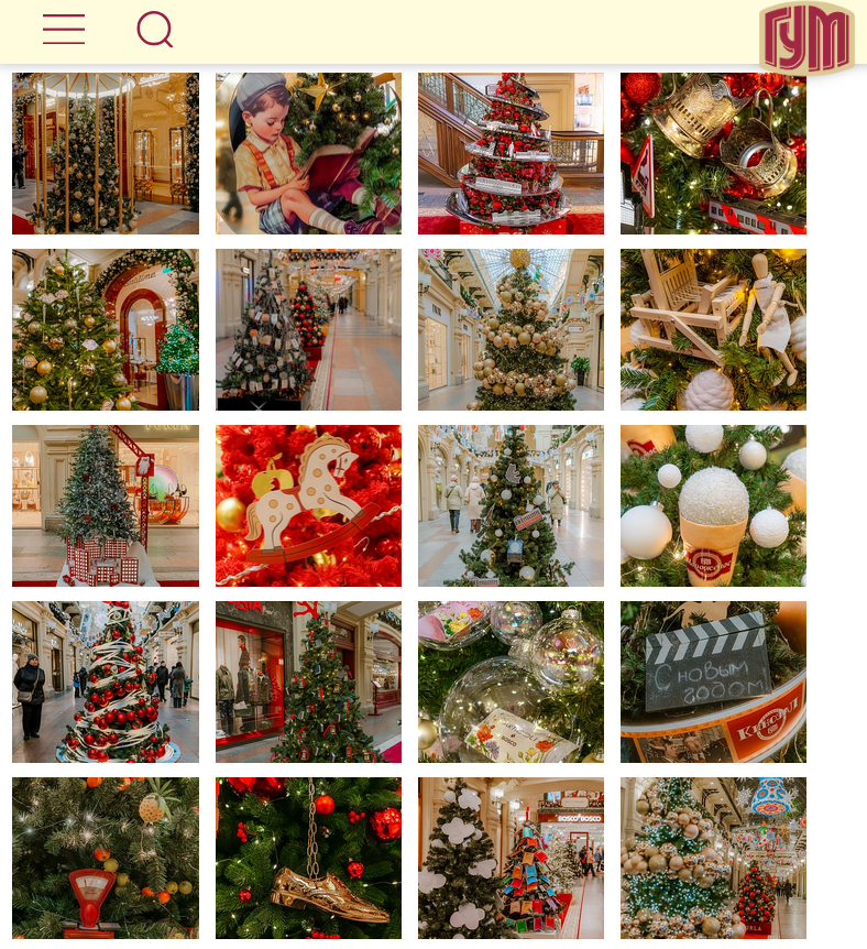 В ГУМе на Красной площади проходит ежегодная выставка новогодних ёлок. Выставка открыта до середины января 2026 года. Проект существует уже несколько лет: под Новый год бренды и партнёры универмага создают свои авторские ели, которые отражают их концепцию и передают атмосферу грядущего праздника. В 2025 году экспозиция включает 81 новогоднюю ёлку. Каждое дерево — с уникальным дизайном. ГУМ ждёт посетителей ежедневно с 10:00 до 22:00.