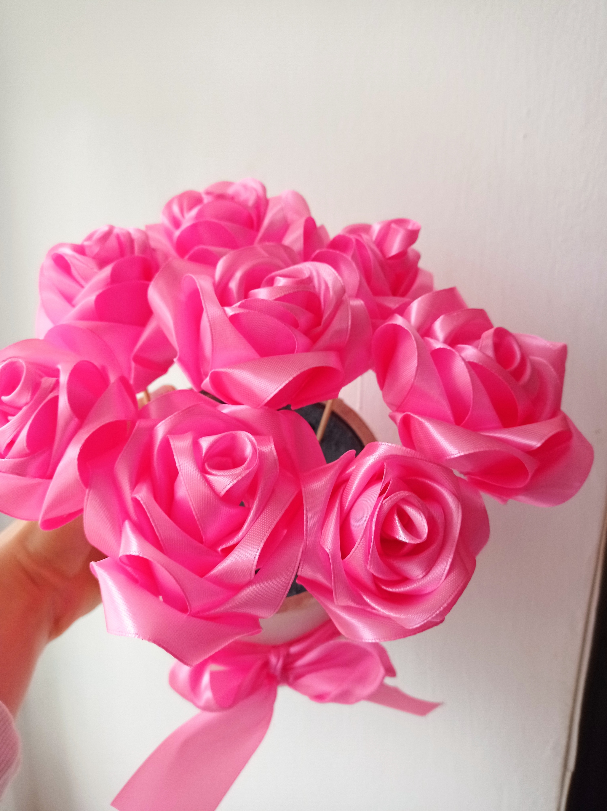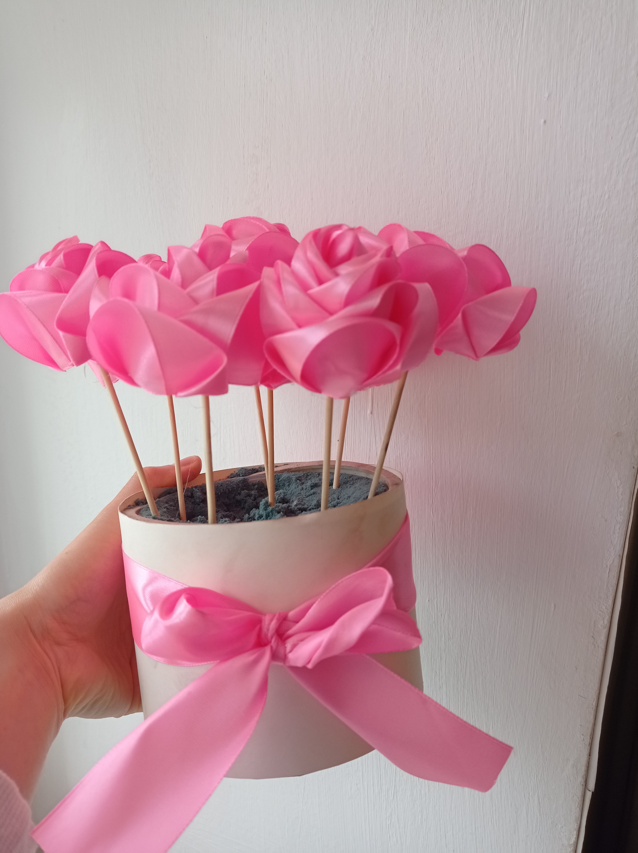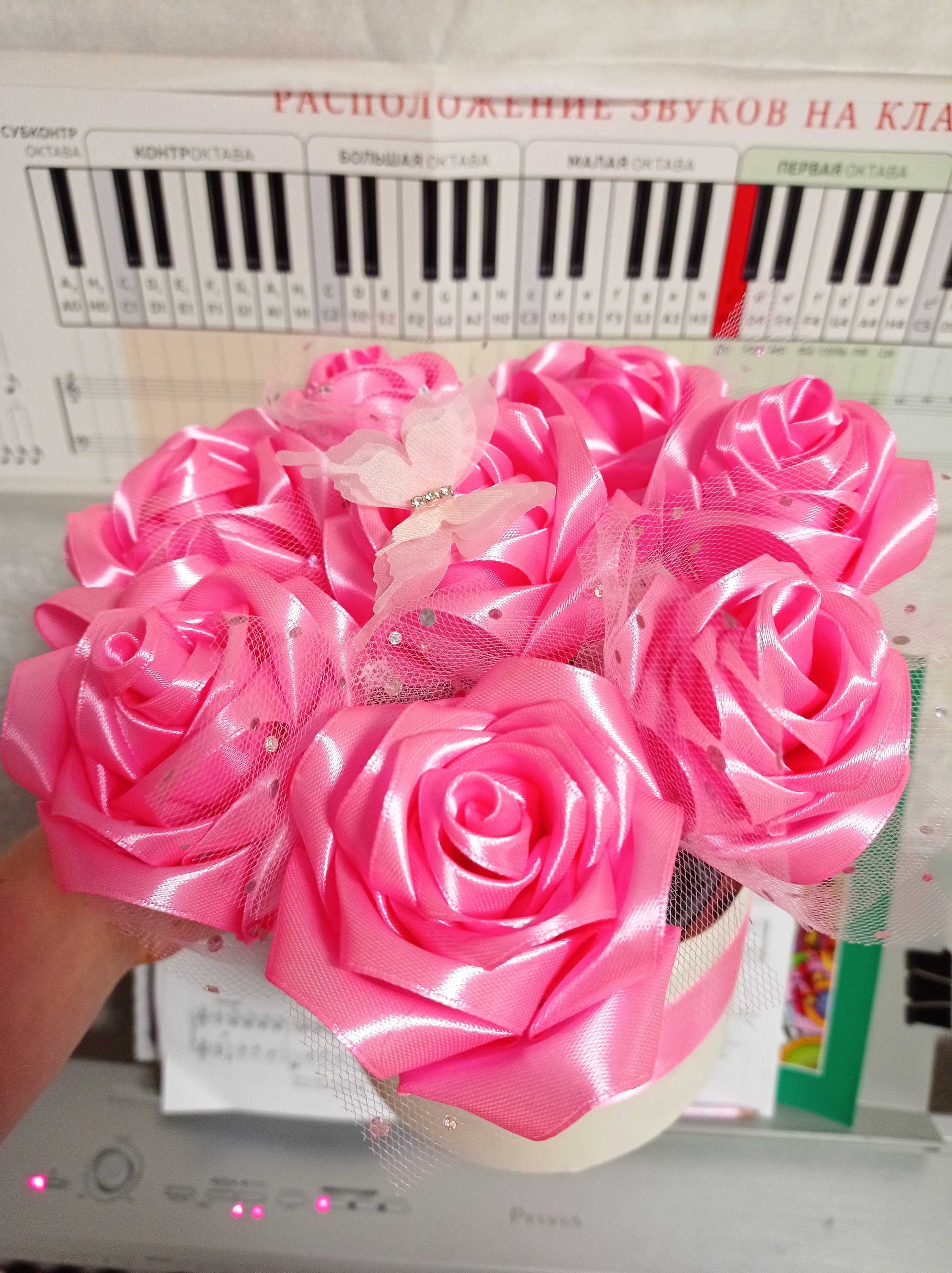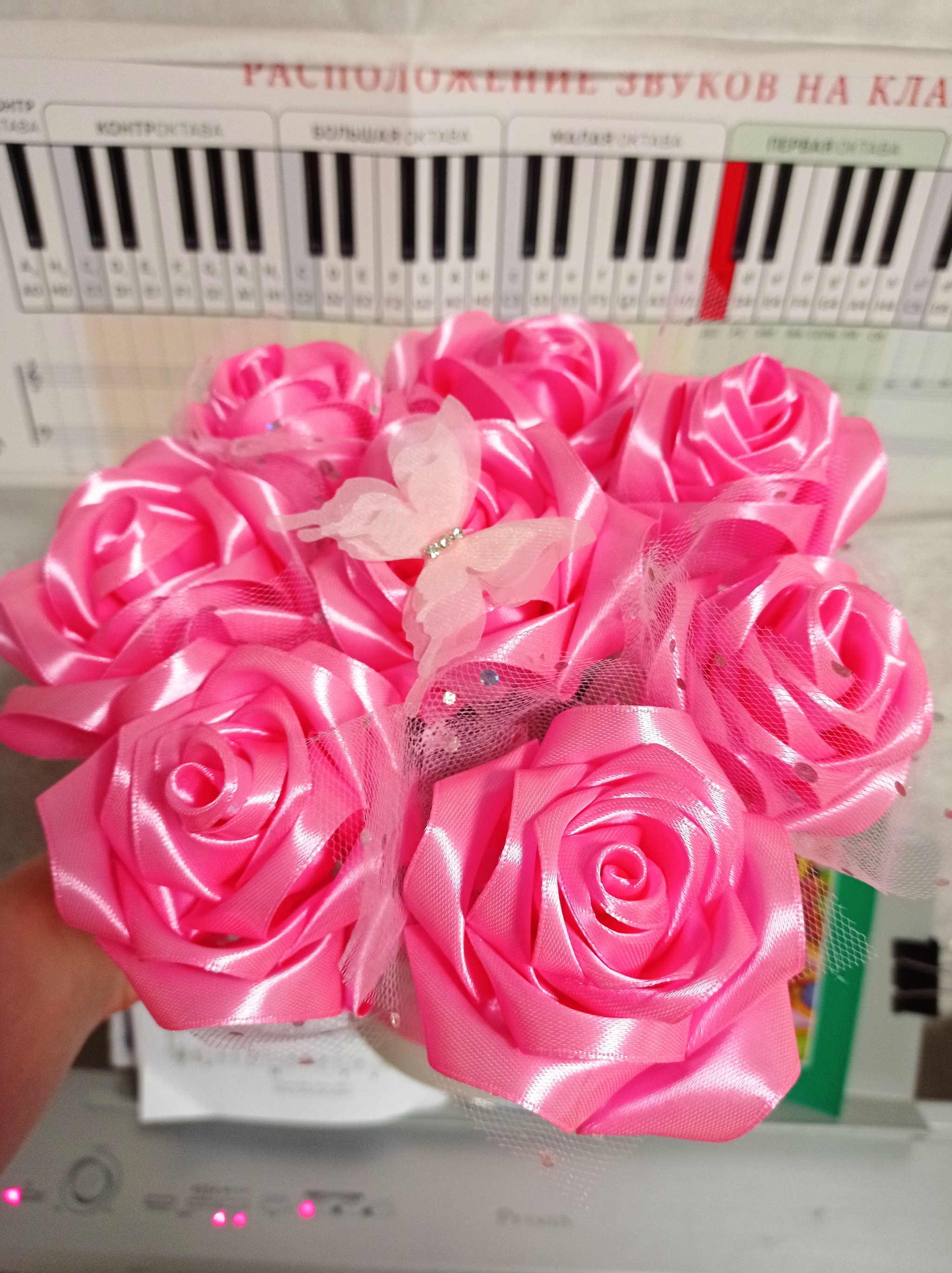 Теперь наш процесс. Как -то вечерком сели с дочкой рукоделить)Доче на выбор было дано несколько цветов ленточек на выбор,она выбрала такой,как на фото.И я в восторге) Цвет мне понравился. Потом я нарезала ленточек и сформировала лепестки,так как дочка пока не понимает как.Зато она помогала мне клеить лепестки и накручивать их на деревянные палочки)с эти она справилась)