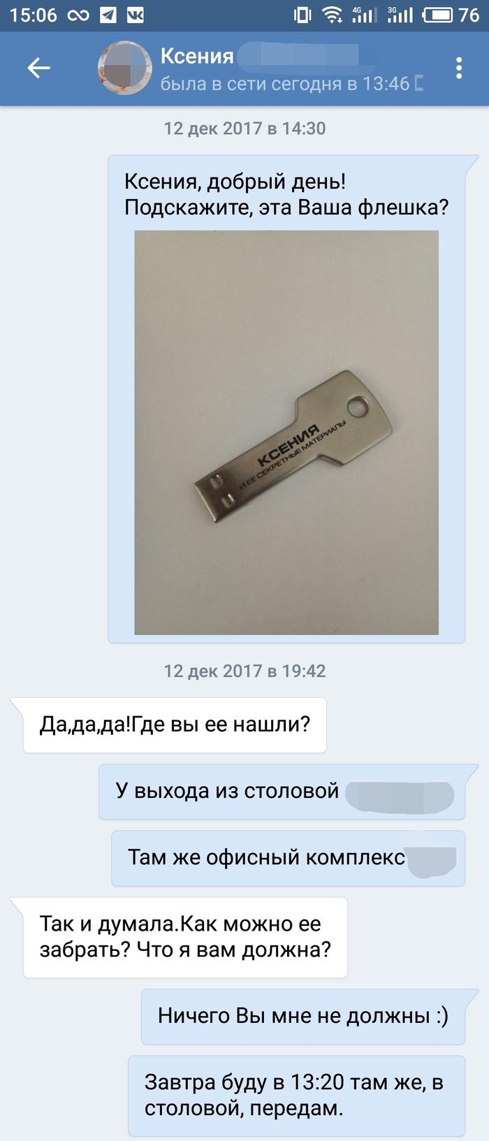 В тот момент я радовался вместе с хозяином флешки, а может даже больше. Подобных историй в моей жизни еще не было, разве что 50р, которые выронил какой-то мужик передо мной стоя в очереди, но там всё за 10 секунд завершилось и без особых стараний.