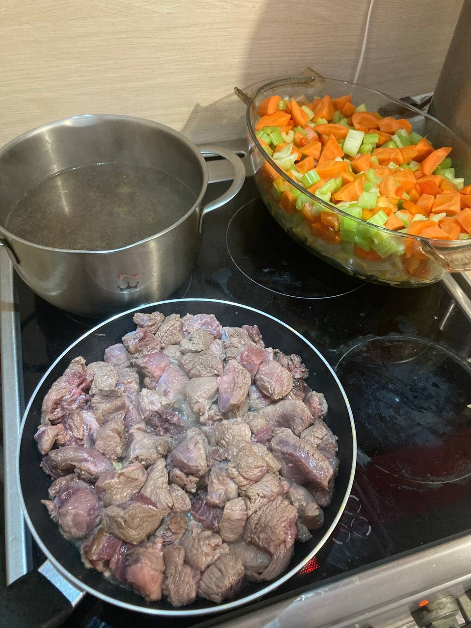 Итак, имея некоторое количество дичи в морозилке, вздумалось приготовить нечто среднее между рагу, стью и просто тушёных овощей с мясом. В чём разница, спросите вы? В количестве бульона и только.