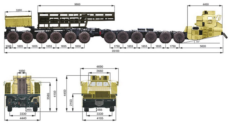 Далее. Длина ракеты "Молодец" — 23 метра. Шасси в длину имеет 32,2 метра с огромным задним свесом (чего на 8-осном шасси МЗКТ для "Ярс" нет в принципе), и имеет разделенные по бокам кабины. Разделенные кабины делаются для того, чтобы между ними располагалась собственно носовая часть ракеты, но на самом первом рисунке мы этого не видим. Тогда для чего разносить кабины, если в передней части не планировалось располагать часть ракеты? Можно было сделать одну кабину по центру.