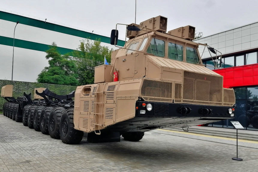 Да, 16-колёсный МАЗ сохранил полноприводную схему и двухмоторную (основной плюс вспомогательный дизель) компоновку. При этом 7906 значительно облегчили по сравнению с предшественником. Обратите внимание хотя бы на колёса гораздо более скромного диаметра.