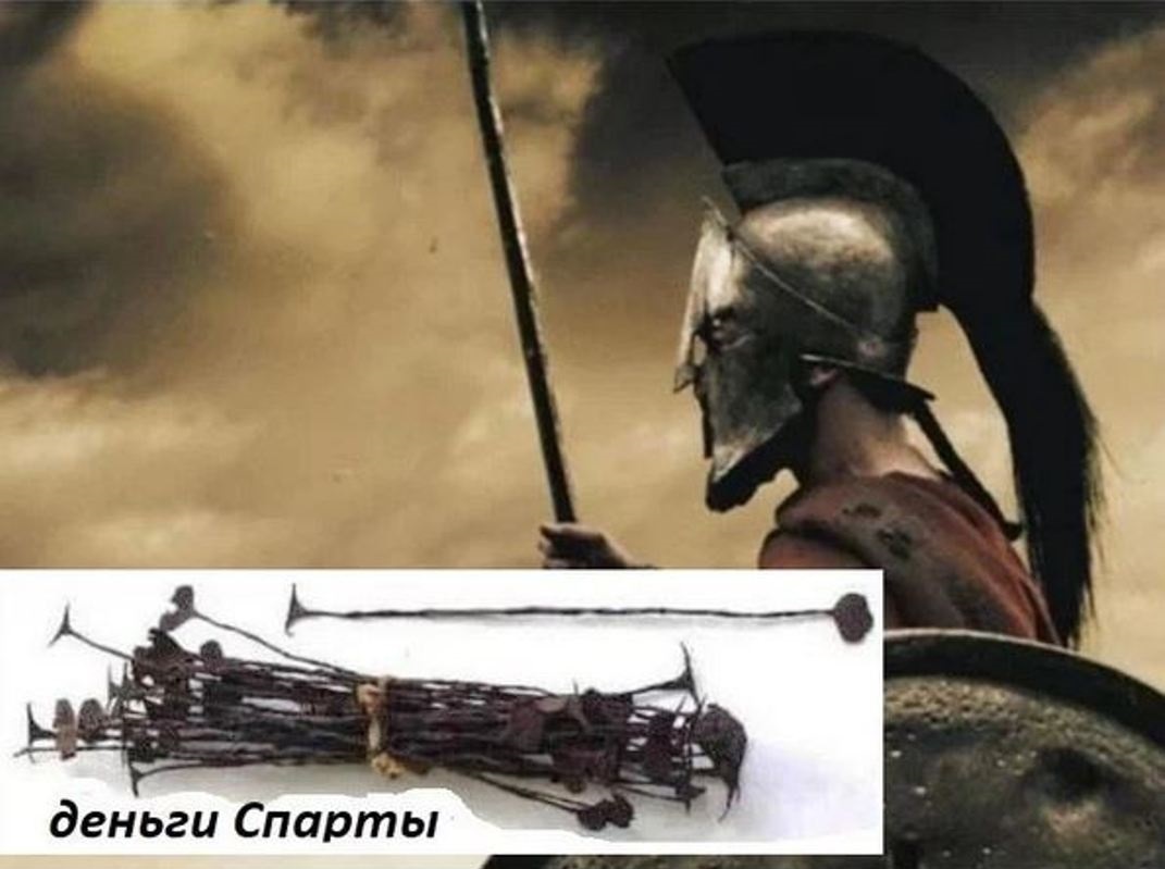 В Спарте было запрещено обращение иноземных денег, т.е., медных, серебряных и золотых монет, которые легко было носить с собой в специальном мешочке. Спартанцы долгое время пользовались только собственными деньгами, представлявшими собой тяжелые металлические стержни.