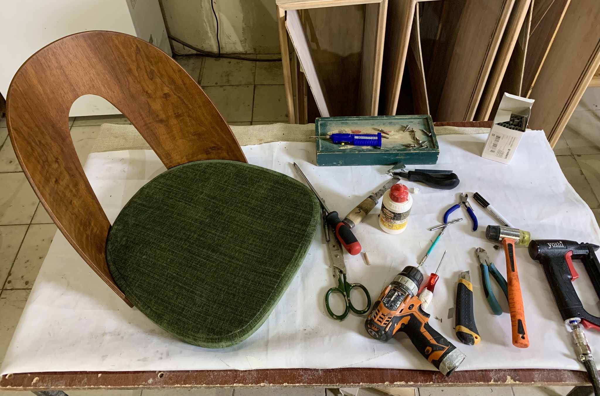 Когда стулья разобраны, старые чехлы отдаём в швейный цех. Ткань выбрал клиент, остановился на шенилле из серии Rain.