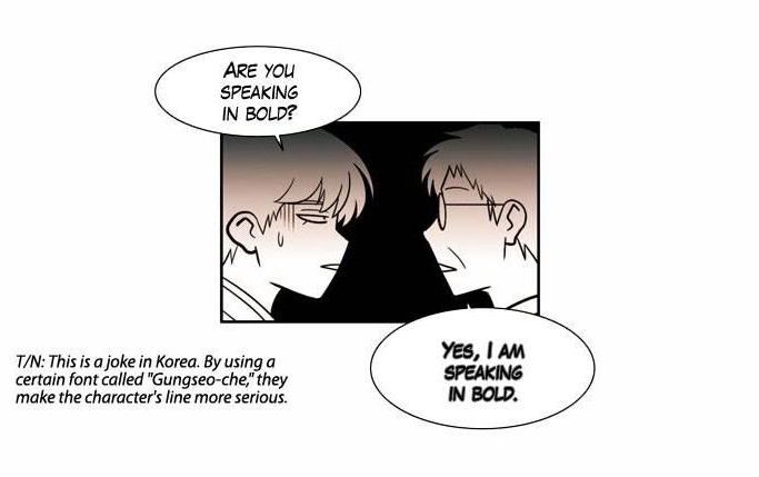П.П.: в оригинале шутка, распространённая в Корее. Используя шрифт Gungseo-che, считается, что речь персонажа становится более серьезной.