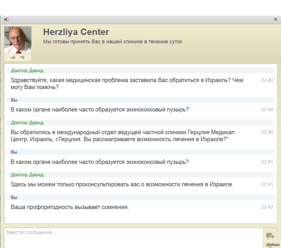 17 SerialEsthete Здоровье Ты не ты, когда ищешь ответы по микробиологии. 10 лет назад Зашел на какой-то медицинский сайт с онлайн-консультантом и спросил у него. Кстати, в конце его ответ был: "Вам решать". [моё] Микробиология Медицина Онлайн-консультант Переписка