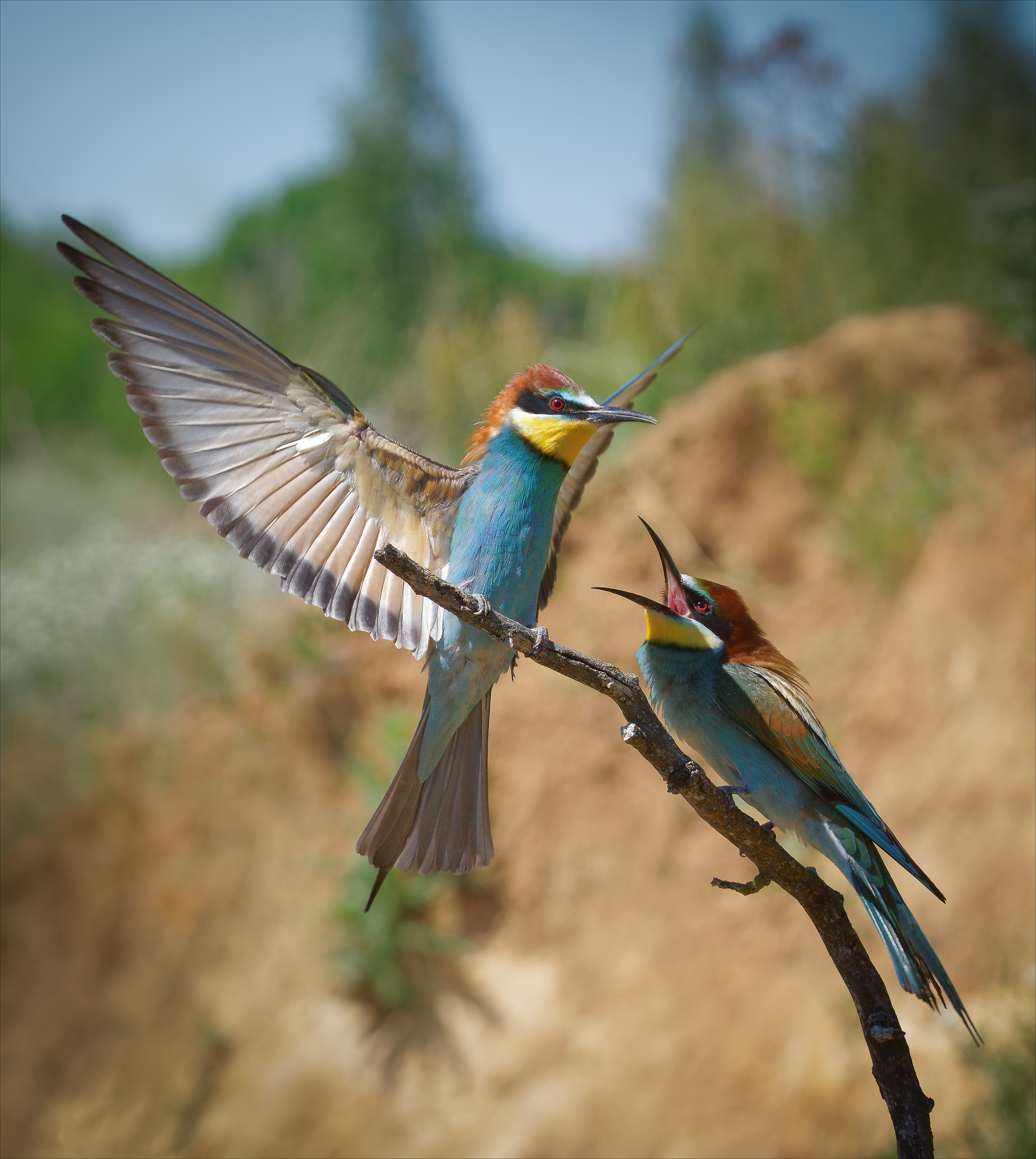 Интересно было снимать этот кадр. Щурки, они очень шустрые и поймать правильный момент можно либо случайно, либо предвидеть действия...ну есть еще третий вариант...Олимпус с его технологией предсъемки в кэш. Олимпуса у меня нет, но есть 12 кадров секунду. Парочка облюбовала присаду и постоянно самец пикировал на одно и тоже место. Но поймать момент я просто не успевал... если следить только в видоискатель, элементарно не видишь траекторию подлетающей птицы. Пришлось одним глазом следить в реальности за подлетом птицы, а другим формировать кадр и следить за фокусом. Вот тогда понимаешь, что такое рассинхронизация работы полушарий и нервных окончаний )