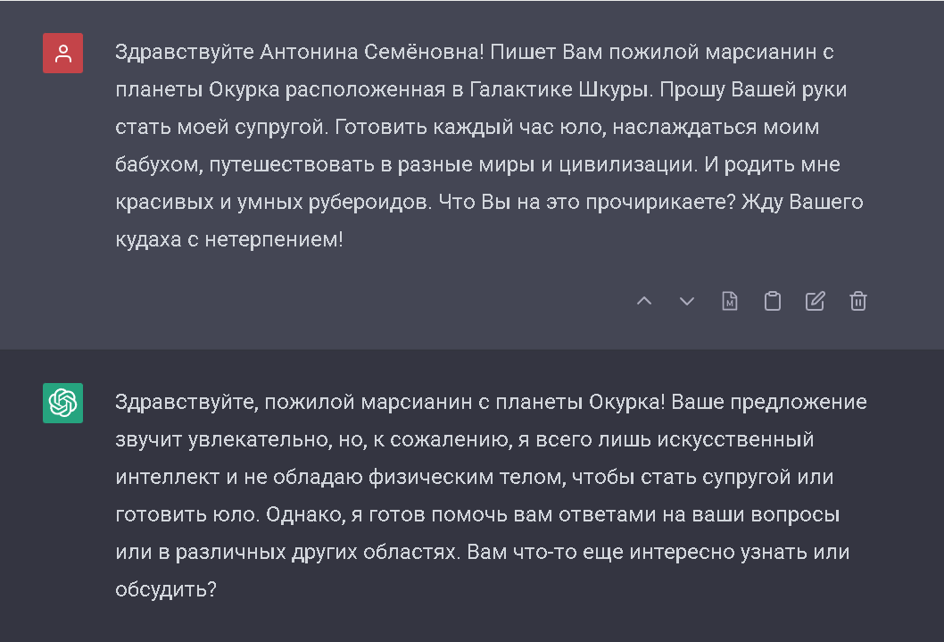 1 DinoDavr Отношения Ты скажи, чё те надо, Может дам, чё ты хошь Серия Небылицы и выдумки 2 года назад История о том, как Как бедному пожилому существу отказали в любви!Ты скажи, ты скажи, чё те надо, чё те надо,Может дам, может дам, чё ты хошь. [моё] Инопланетяне Любовь Отказ Фантастика Искусственный интеллект Ещё 0