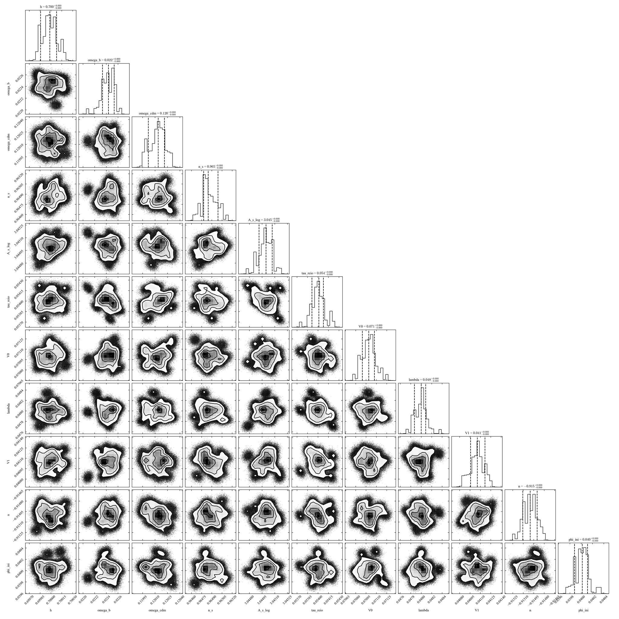 Анализ методом Монте-Карло Маркова позволил получить одномерные и двухмерные маргинализованные апостериорные распределения для 11 параметров гибридной скалярной полевой модели, отображенные на диаграмме угловых корреляций.