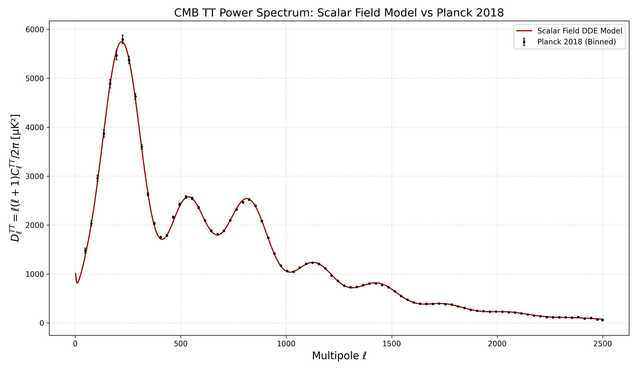 Лучшая оценка, полученная из гибридной скалярной полевой модели, прекрасно соответствует угловому спектру мощности температурных флуктуаций космического микроволнового фона (CMB TT), представленному данными Planck 2018 (черные точки с погрешностями).