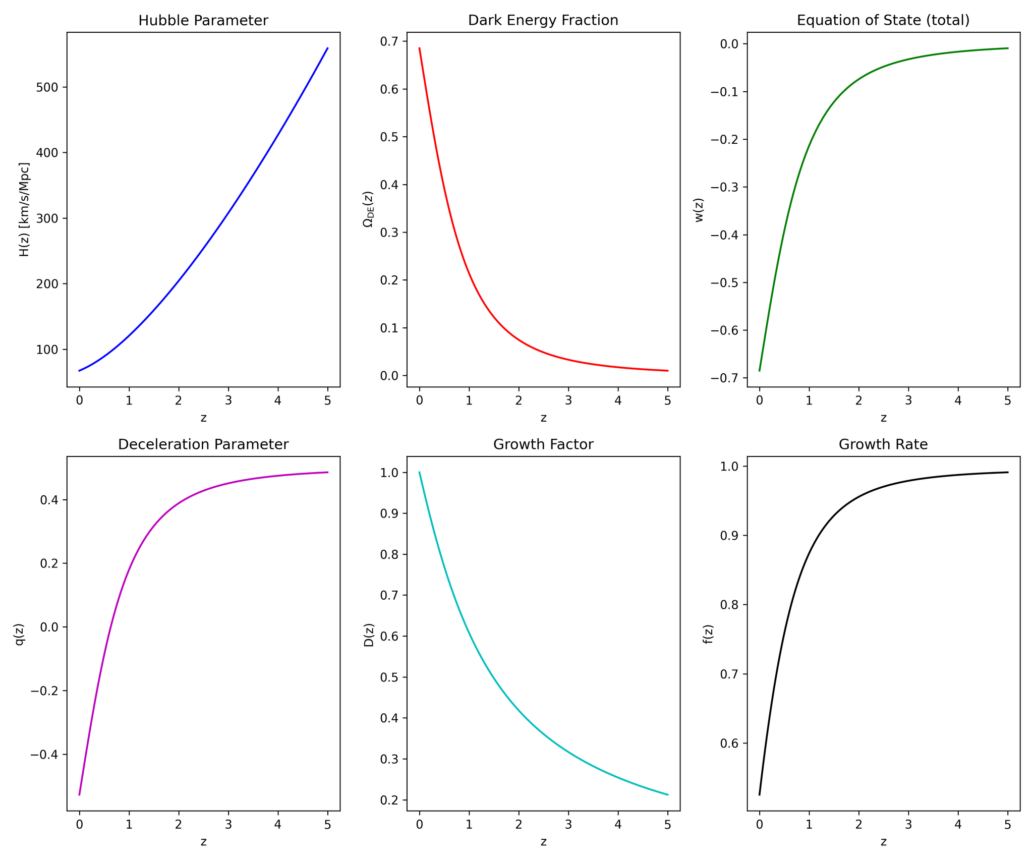 В рамках наилучшей модели, эволюция ключевых космологических параметров – параметра Хаббла H(z), доли плотности тёмной энергии Ω_DE(z), уравнения состояния w(z), параметра замедления q(z), фактора роста D(z) и скорости роста f(z) – демонстрирует взаимосвязь этих величин в зависимости от красного смещения, раскрывая динамику расширения Вселенной и поведение её компонентов.