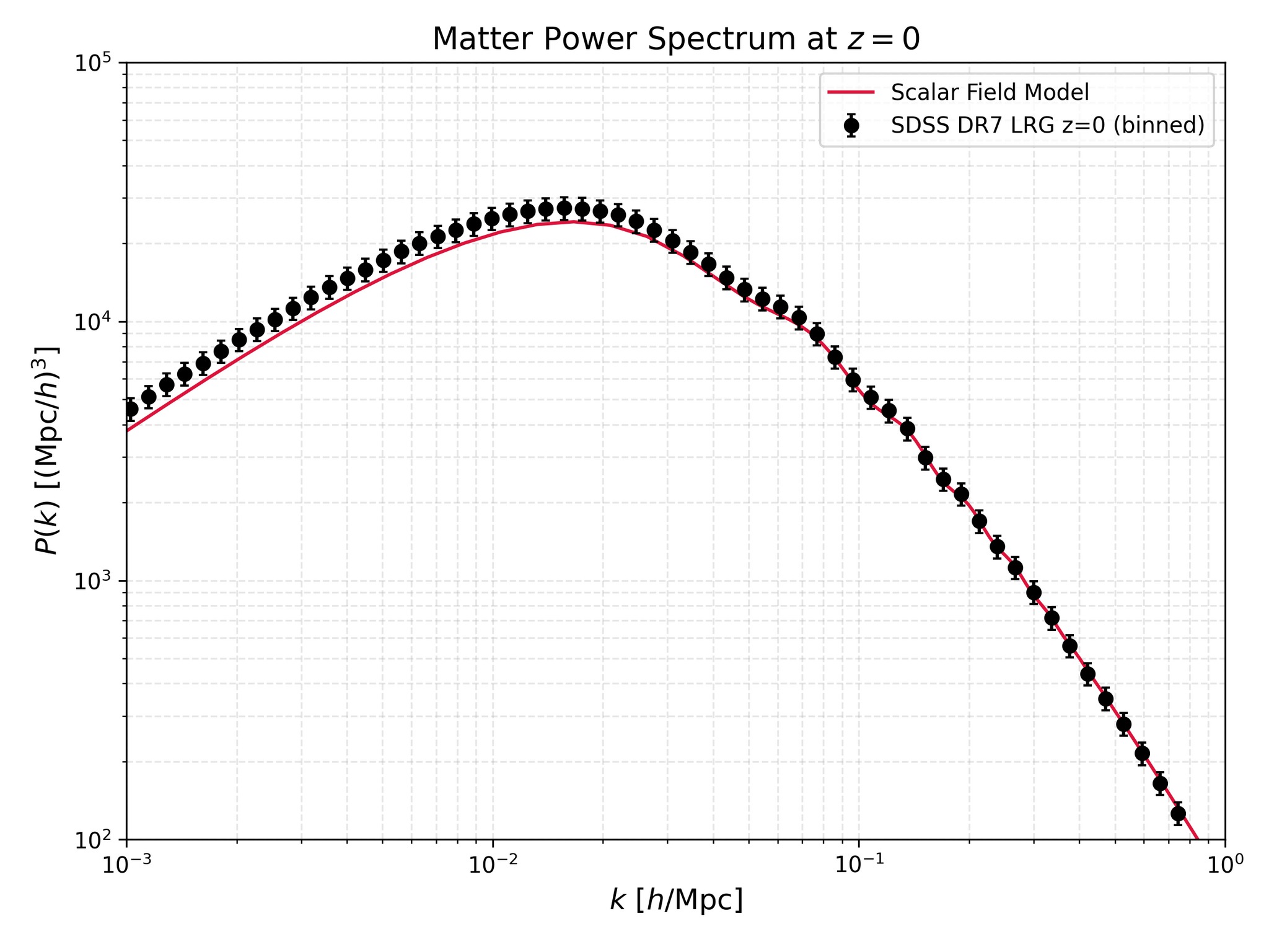 Предсказания наилучшей модели демонстрируют отличное соответствие наблюдаемым данным выборки LRG из SDSS DR7 (черные точки) для спектра мощности материи P(k) при красном смещении z=0.