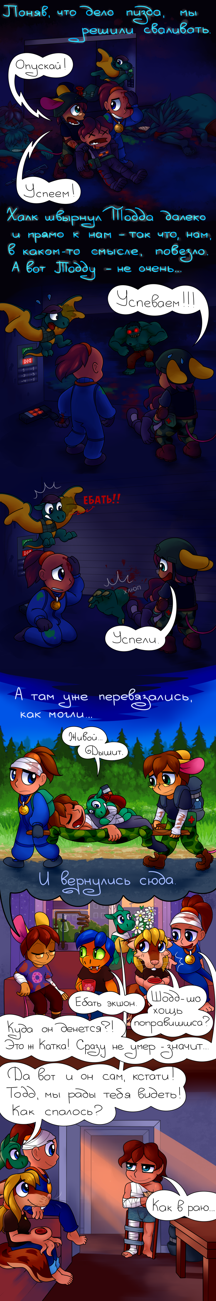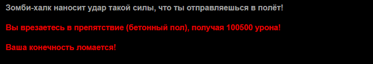 Мой комментарий: Во имя драматизму автор немного понизил силу Халка. Это машина смерти, его практически ни одни двери не способны удержать. И бронированные в том числе. Он видит примерно вдвое дальше обычных зомби и очень быстро двигается. В 0.F. вполне реальна ситуация, когда ты в лабе чем-нибудь гремишь и с двух сторон к тебе приходят Халки, просто проходя сквозь стены. Мне так машину однажды чуть на этаж ниже не уронили. Как бы я ее доставал я даже хз. =) В общем такие шашлыки как мы, при реальной встрече с ним явно не вывезли бы, раскидал бы как щенят.
