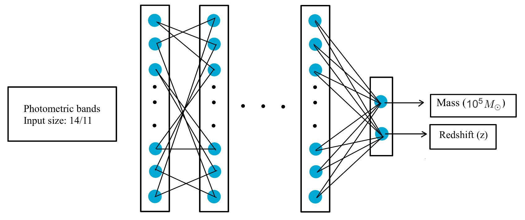Сеть прямого распространения, обученная на 11 или 14 фотометрических диапазонах наблюдений JWST/NIRCam, позволяет оценить массу звезды (в единицах 10⁵ солнечных масс) и красное смещение, раскрывая различные сценарии формирования структур, учитывая как адиабатическое сжатие, так и захват SMDS.