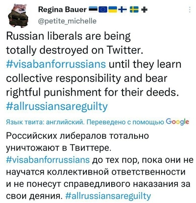 Западные политики и публицисты даже с русских либералов требуют платить и каяться, потому что коллективная ответственность к русским очень даже применима, отсюда хэштег #AllRussiansAreGuilty ("виновен каждый русский").