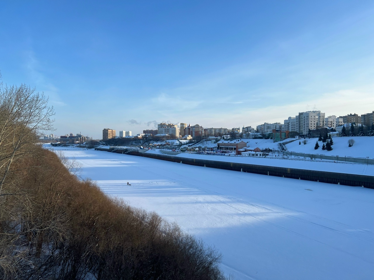 Набережная впечатляет, но назвать ее отличной - большой комплимент. В Перми, Нижнем Новгороде, Ростове-на-Дону или Архангельске мне понравились больше. Как будто пустовато при таких масштабах. Но! Безусловно лучше, если набережная есть, чем ее отсутствие. В районе пароходства увидел как с берега в реку катаются дети. Крутизна склона там весомая, даже страшно немного. С противоположного берега тоже катаются, но там гораздо площе.