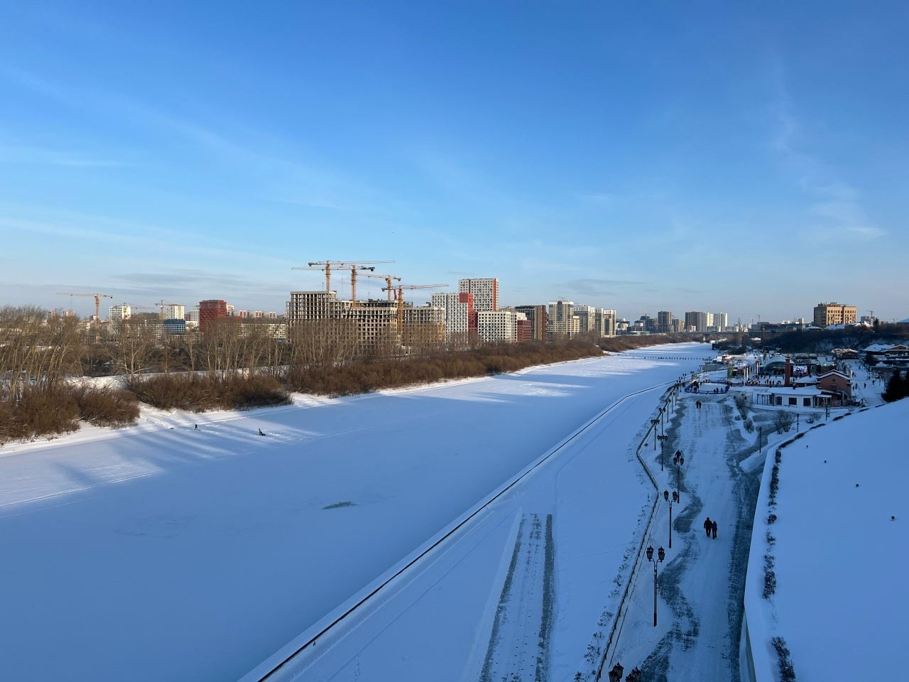 К западу от моста Челюскинцев (это автомобильный мост, одна из главных межбереговых артерий) доминировала частная застройка и лишь на горизонта над ними грозно нависали многоэтажки, то к востоку от моста (как раз напротив пароходства) в каких-то колоссальных масштабах возводились высотки.