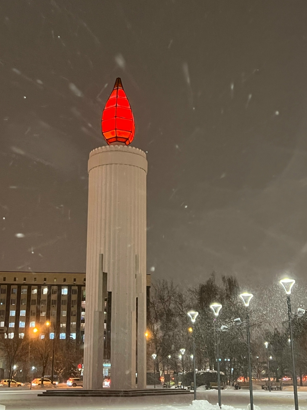 У меня оставалась ещё одна локация - это "Свеча Памяти", которая тоже в темноте подсвечивается. Решил идти пешком, ибо на дороге стали возникать заторы из-за снегопада. Кстати впервые за всю поездку встречаются электрокары (до этого я словно провалился в какой-то хартленд ДВС). А про то что электротранспорт здесь не жалуют, я уже писал.