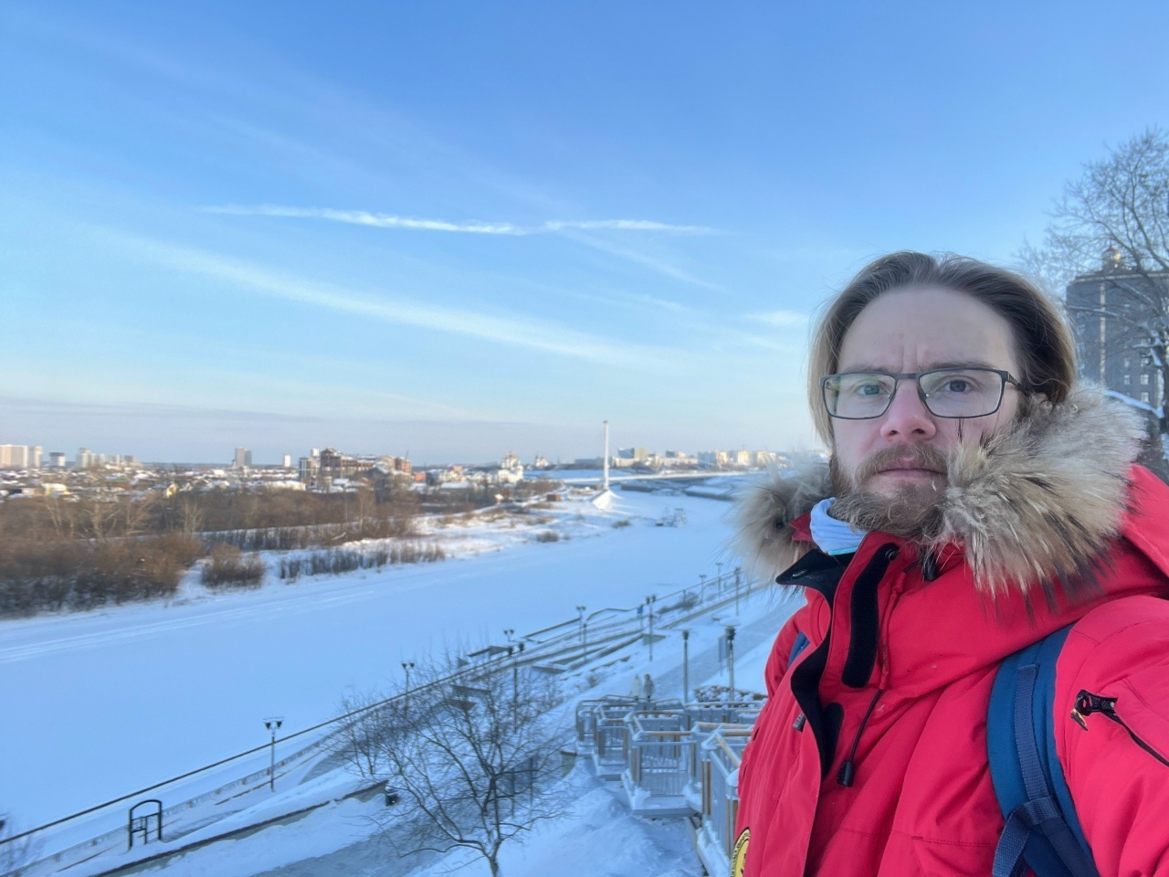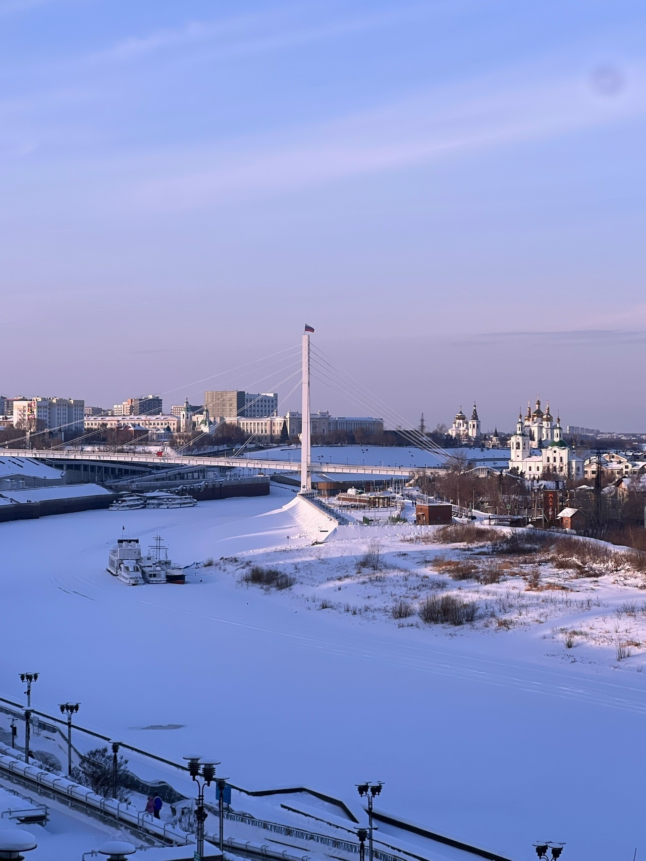 Обязательно вам укажут, что она "единственная четырехуровневая в России", но для набережной это не главное. Полтора дня я проболтался преимущественно в центре города (надо сделать поправку, что не силен в вернакулярной географии Тюмени, поэтому буду называть на свой лад, а аборигены поправят потом). И, действительно, если благоустройство многих городов Центральной России огра6ичивается сугубо территорией неподалеку от администрации или Кремля, то в Тюмени к этому вопросу подходят масштабно. Опять же, крутые фонари нивелируются очередным размахом заборостроения, велодорожки есть даже, но они под наледью, а комфортабельность автобусов компенсируется отсутствием электротранспорта. Хотя мне кажется, что объемы людских потоков в городе такие, что для многих трамвайных маршрутов работа бы нашлась.