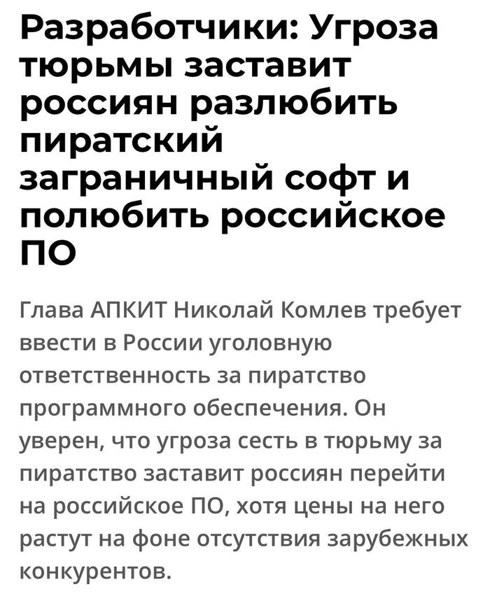 пока россияне пиратят (кстати, неважно, российский или зарубежный софт), отечественные разработчики теряют деньги — в результате сокращается база для инвестиций на новые проекты, госбюджет остается без налогов и замедляется импортозамещение.