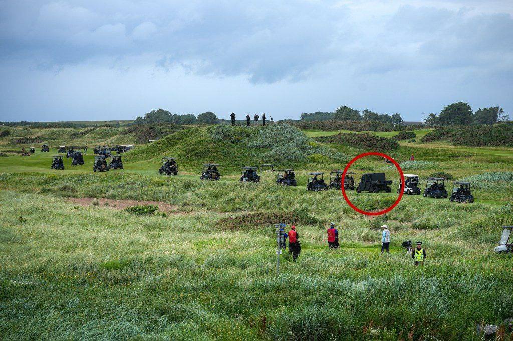 Журналисты заметили укреплённый чёрный вездеход, сопровождавший Трампа во время игры в гольф в 🏴Шотландии.