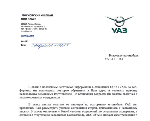 Доброго! У друга случилось беда - сгорел УАЗик. Но самое странное, что теперь производитель - УАЗ требует с него за это денег! Пытаемся привлечь общественное внимание. Даю слово другу: