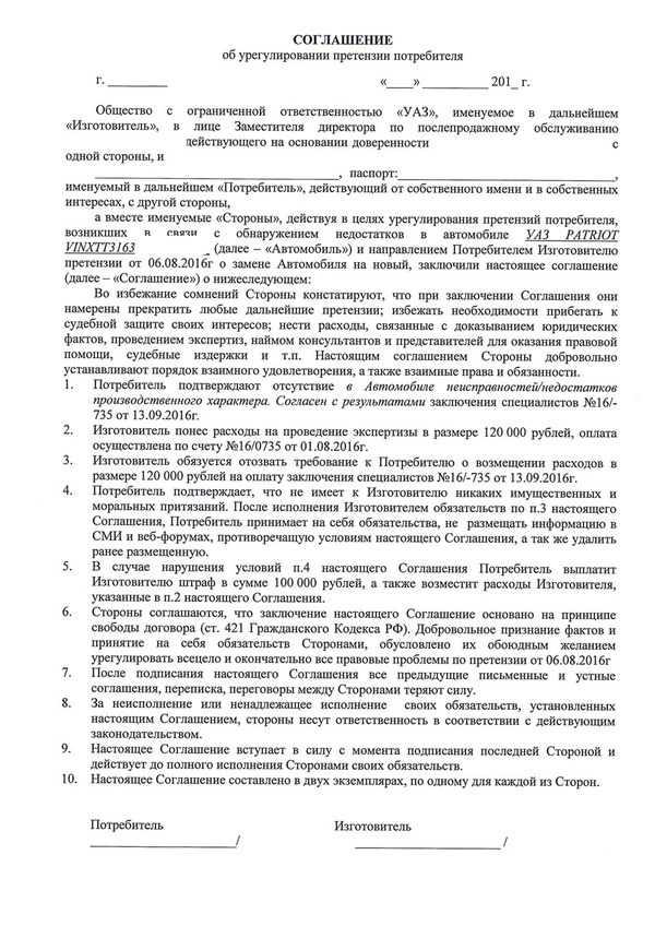 После того, как я описал эту историю на форуме и в некоторых СМИ, представители УАЗа снова вышли со мной на связь и предложили "пойти на мировую", но только с условием, что я удалю все негативные упоминания на форумах об этой истории. а если не удалю - то еще 100тыс штрафа. такой вот автопром... сейчас собираю документы готовлю встречные иски, а заодно пытаюсь привлечь внимание собратьев, общественности к этому беспределу.